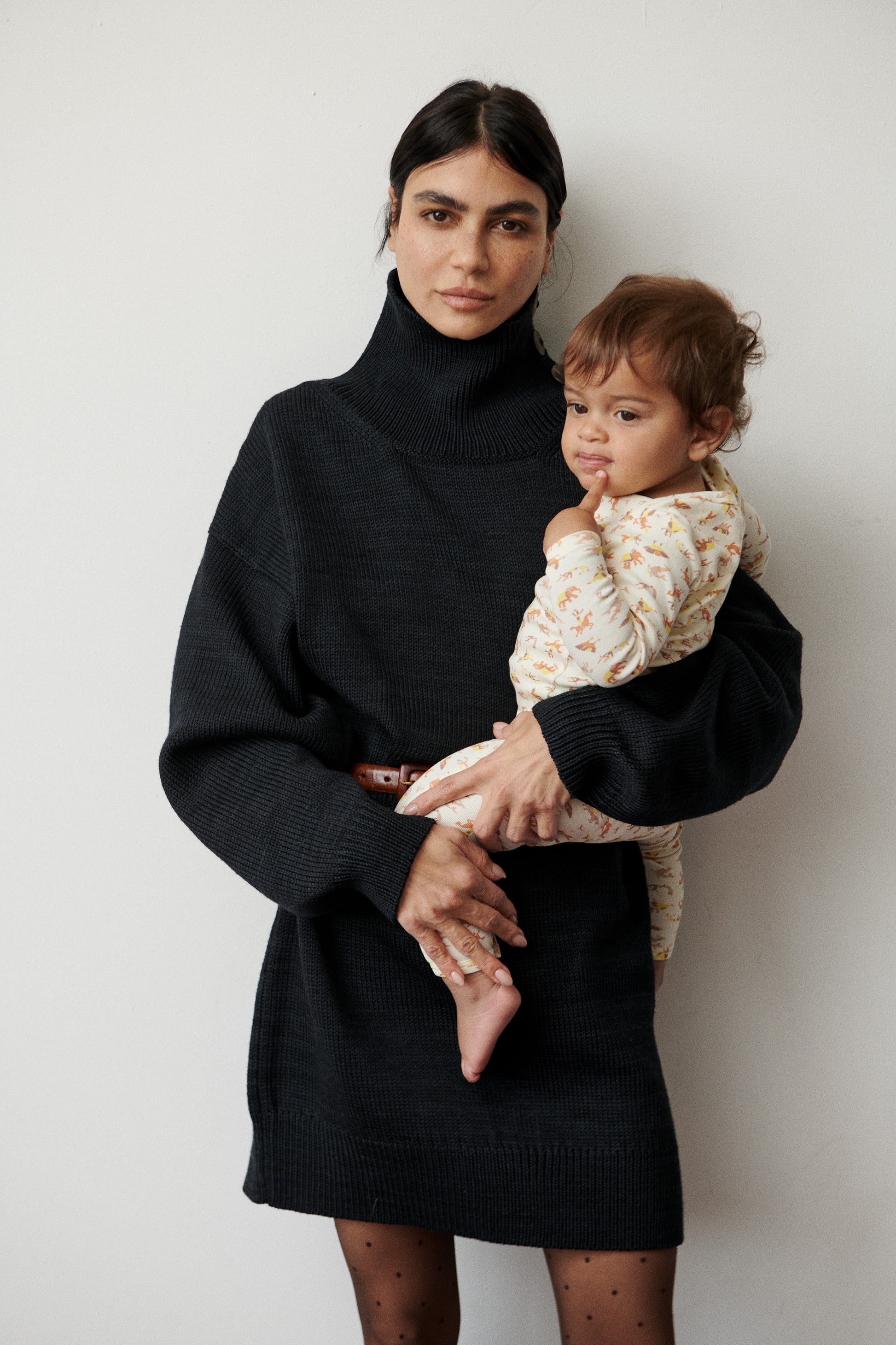 A turtleneck dress in Merino wool, featuring a foldable ribbed turtleneck with side horn button closure, a straight silhouette, and ribbed trim.