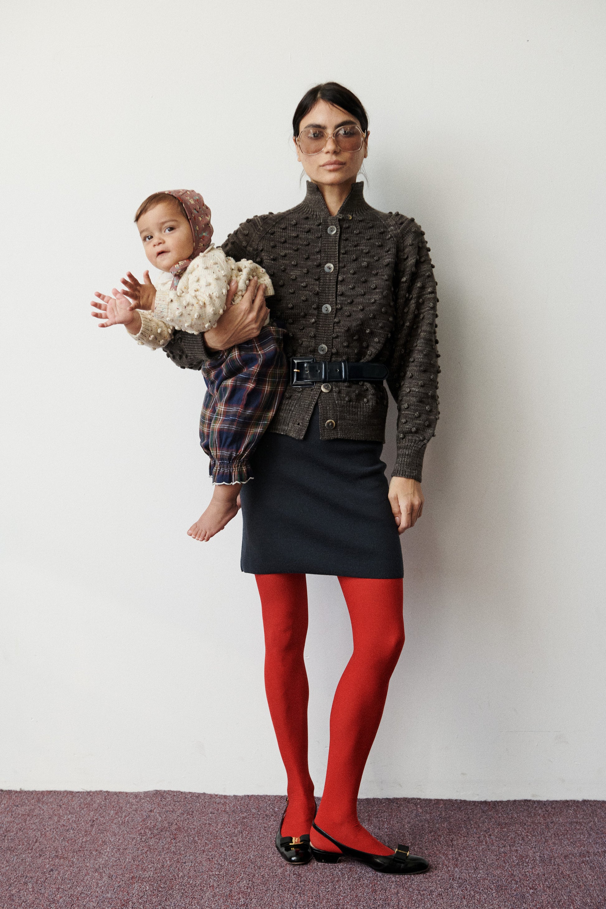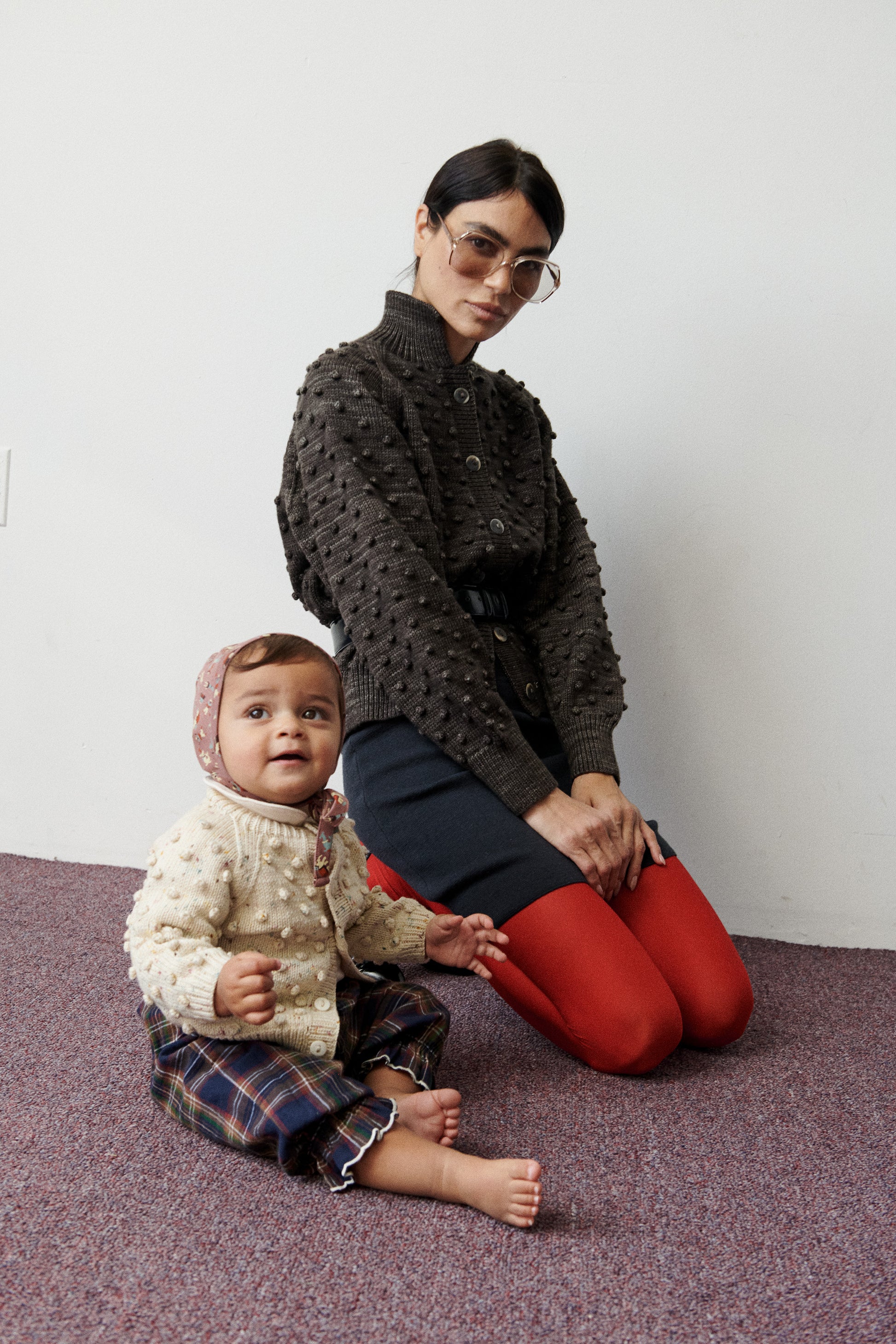 A hand-knit popcorn-stitch cardigan in Merino wool, featuring a slightly relaxed silhouette, raglan sleeves, ribbed trim, crossover button closure at the neck, and horn button closure down the front.