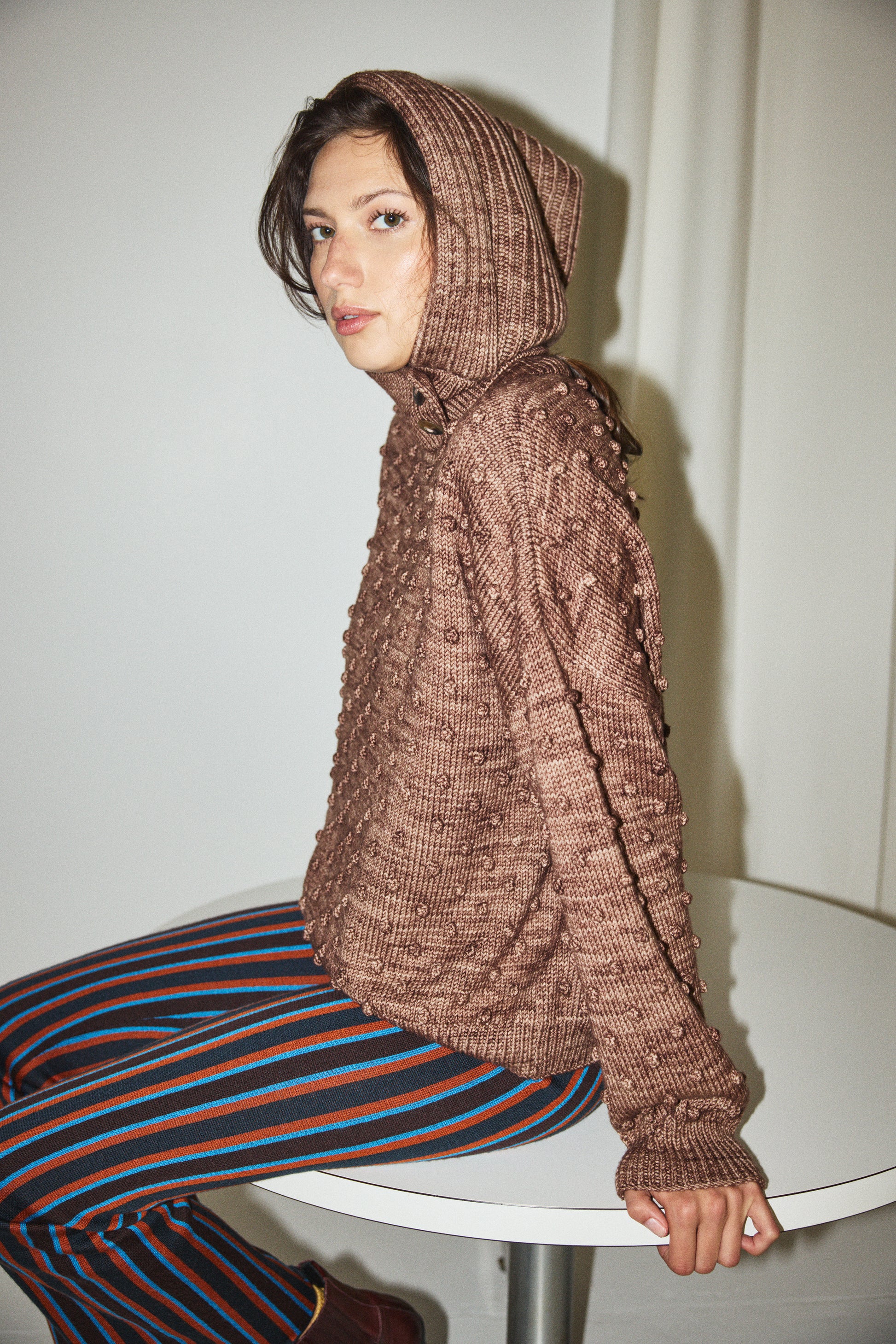 A versatile hood in a soft Merino-cashmere fisherman knit, featuring ribbed trim and horn button closure.