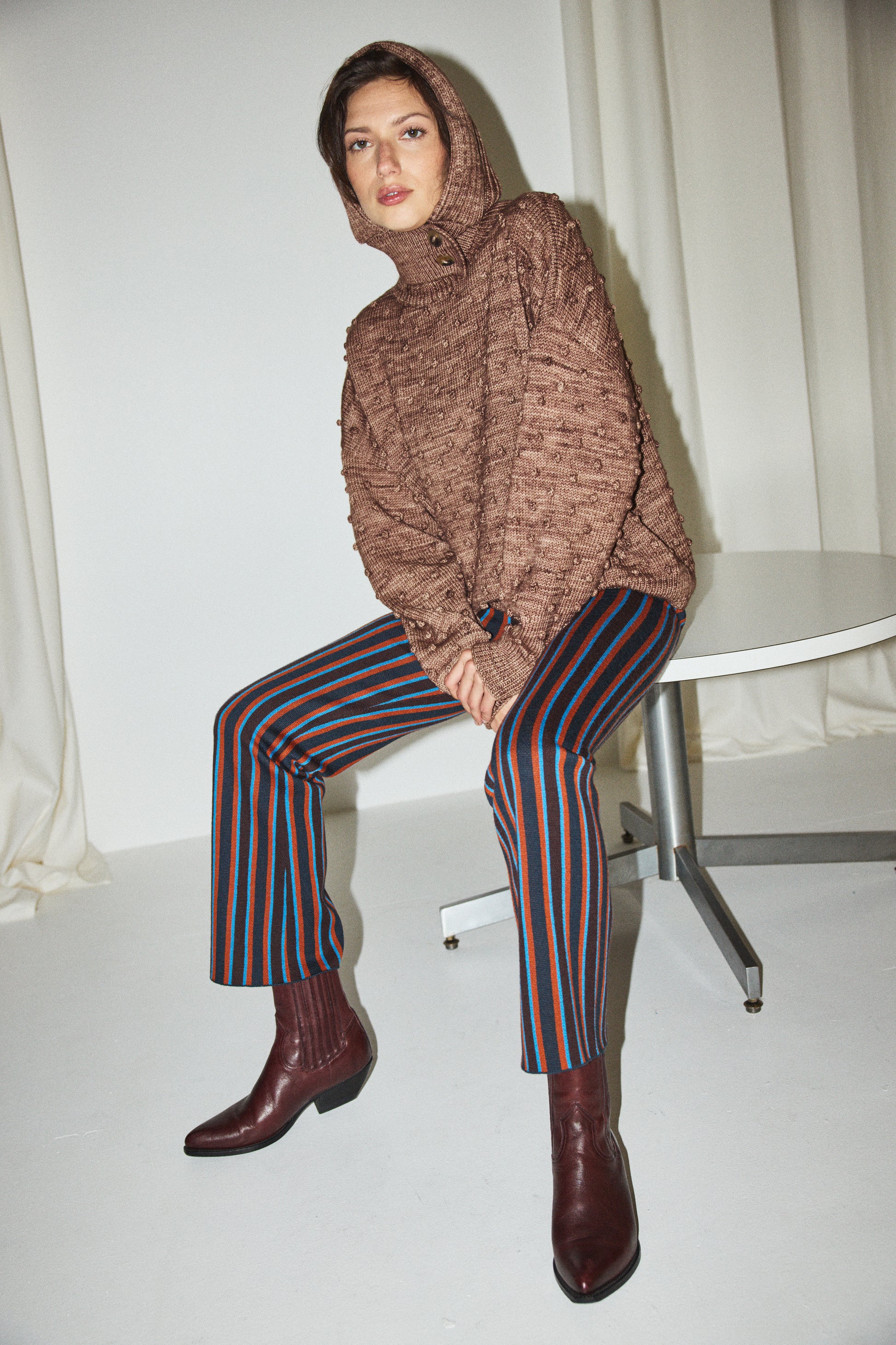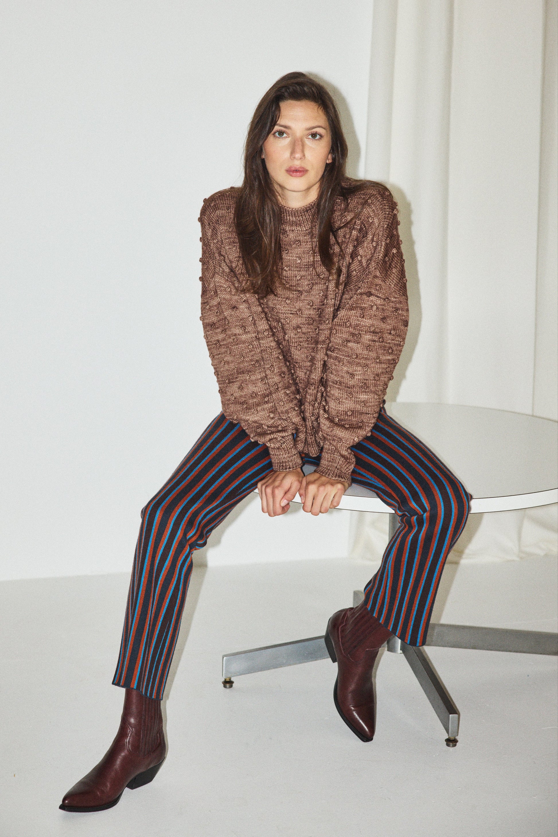 A hand-knit popcorn-stitch pullover sweater in Merino wool. Featuring drop shoulders, a boxy silhouette with a drawn-in waist, and a subtle mock neck.