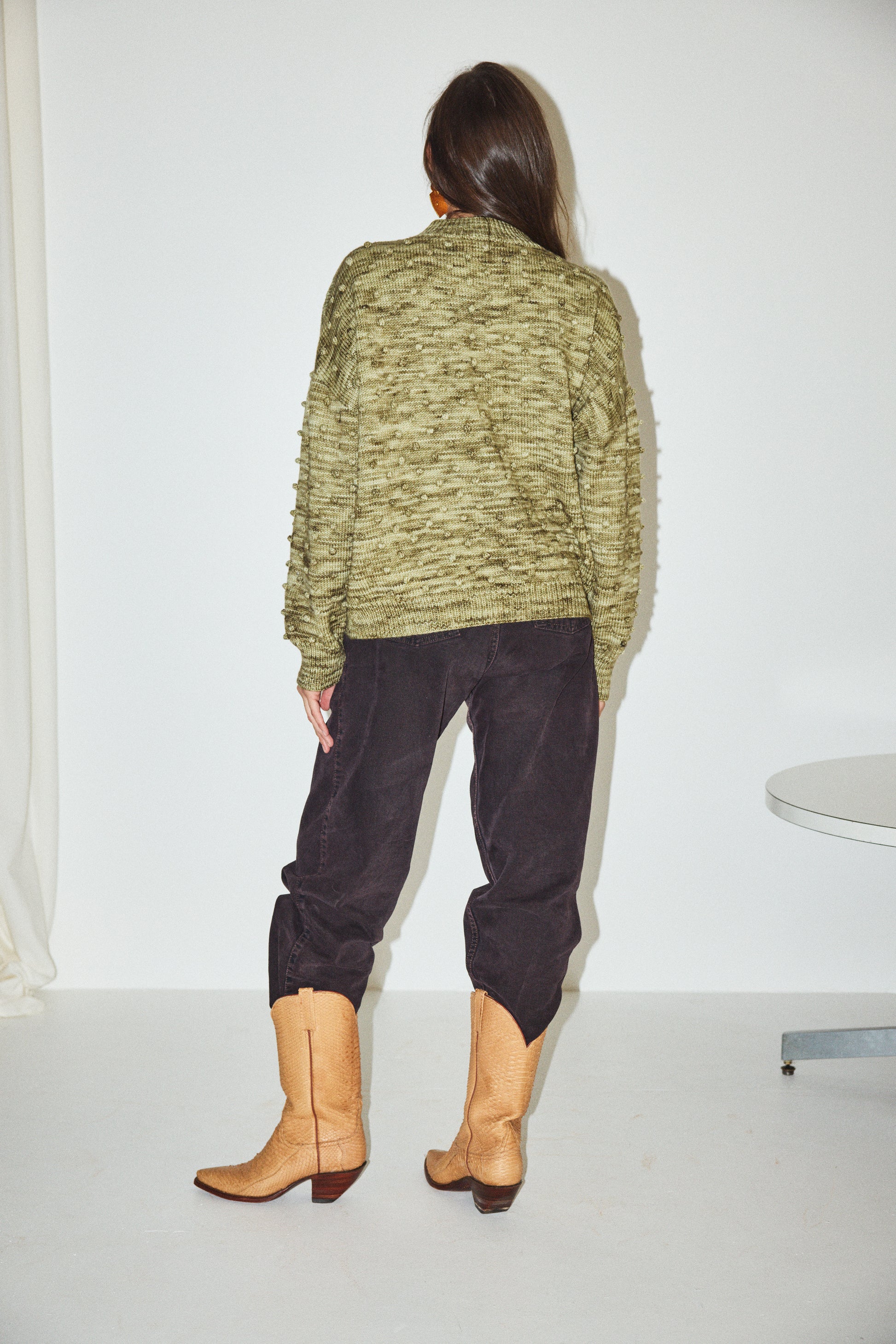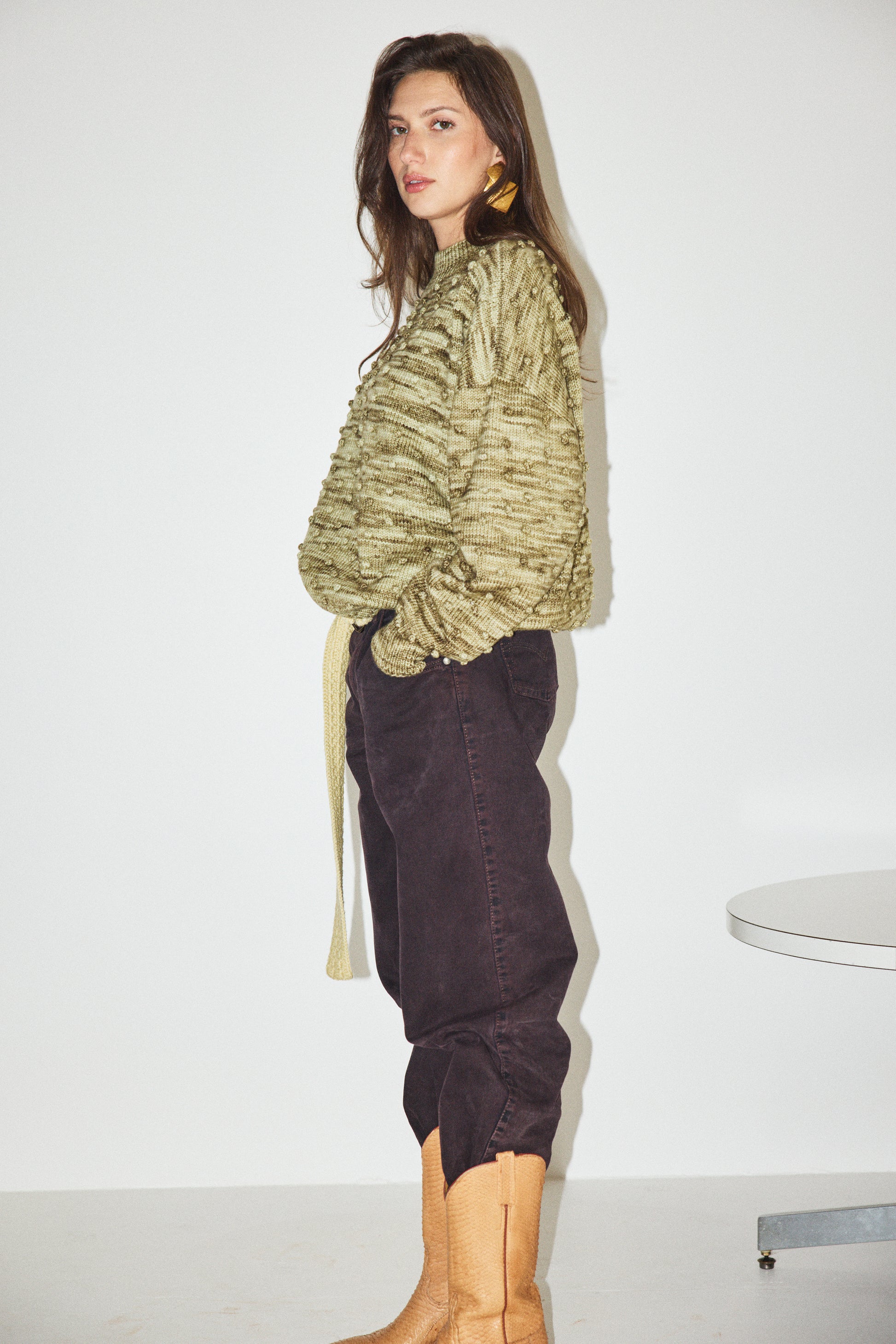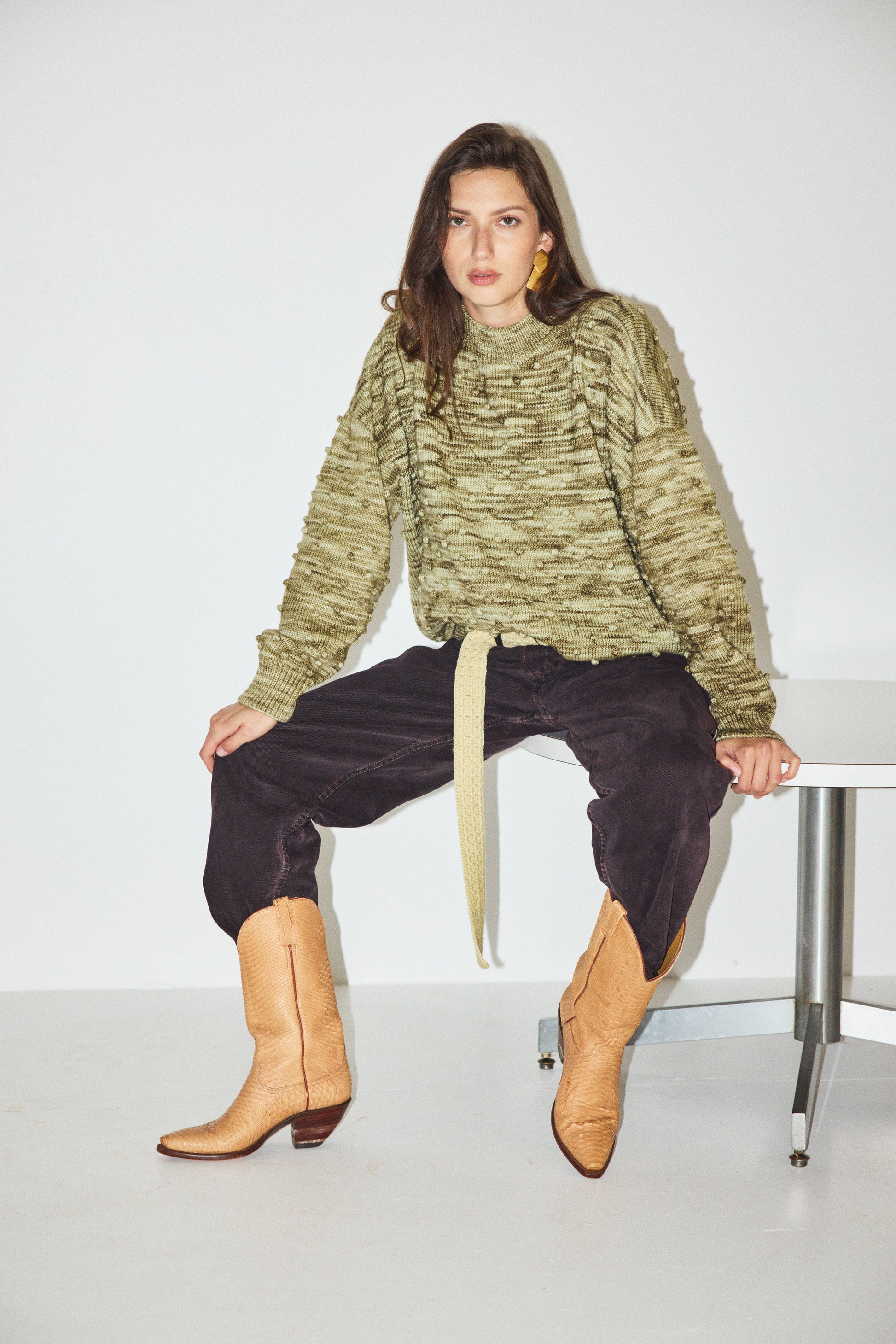 A hand-knit popcorn-stitch pullover sweater in Merino wool. Featuring drop shoulders, a boxy silhouette with a drawn-in waist, and a subtle mock neck.