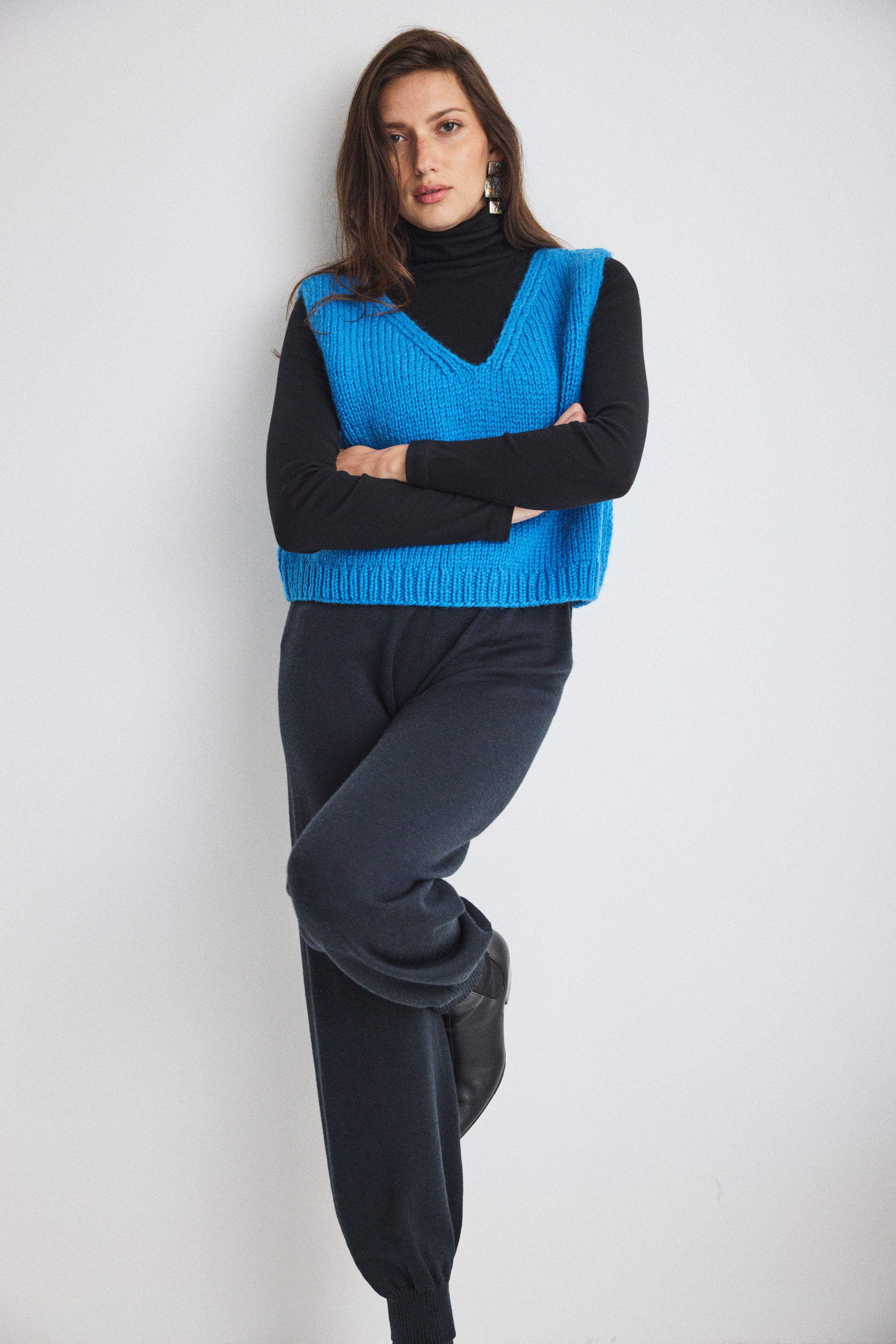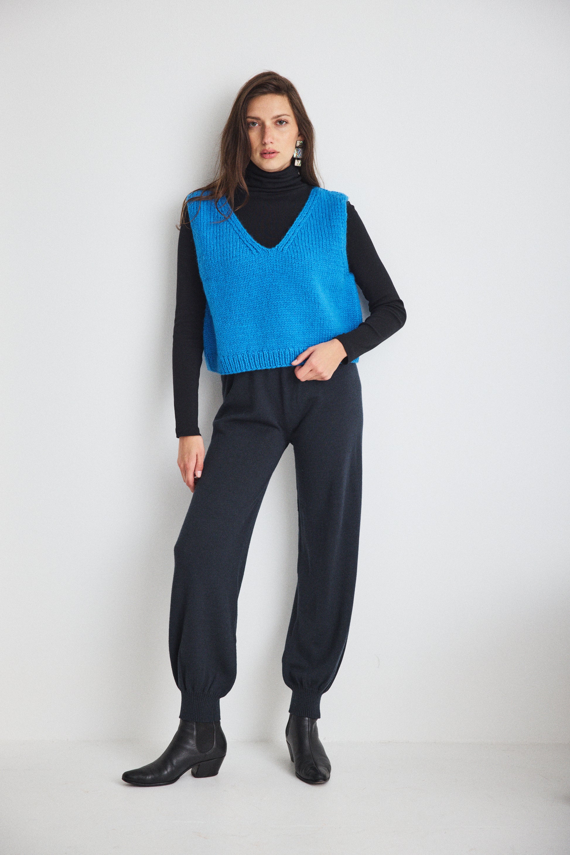 A hand-knit v-neck vest, crafted in lofty 100% Highland wool. Featuring a slight bubbly shape and ribbed hem. Hits most at the waist.