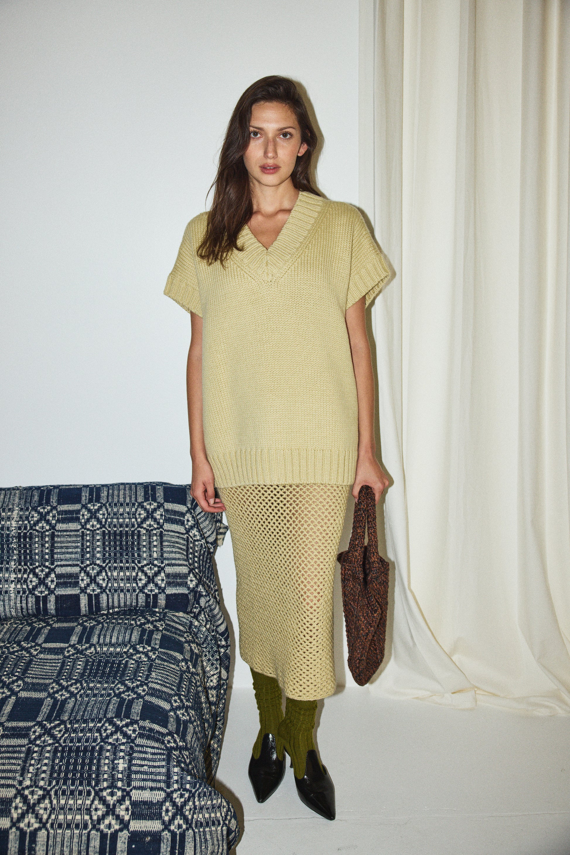 A pullover v-neck vest, crafted in lofty 100% Highland wool. Featuring a wide-ribbed neckline, cuffs, and hem. A super versatile piece that floats around the body and works as a dress popover or effortlessly elevates everyday looks like a T-shirt and jeans.