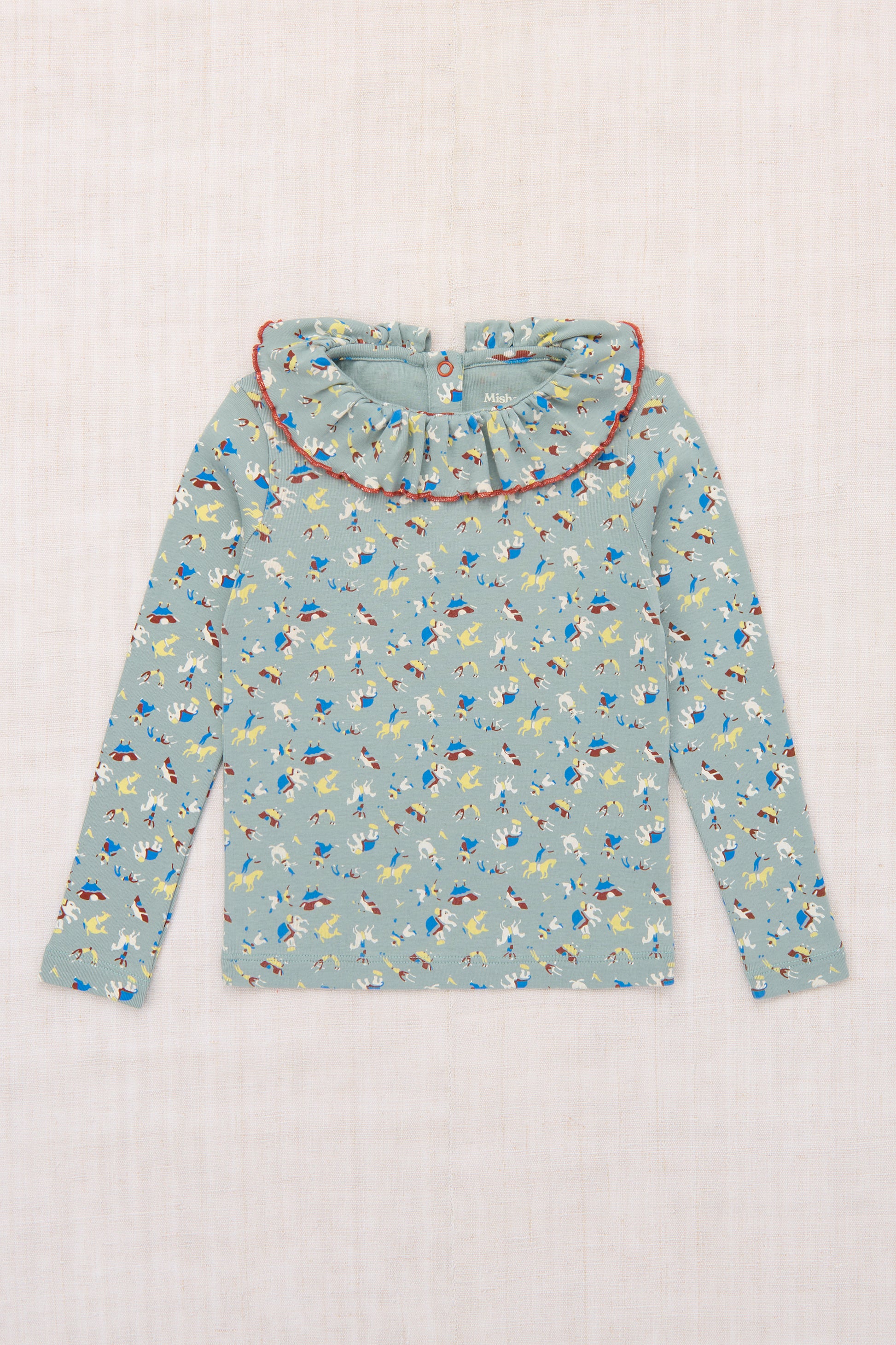 A long-sleeved slim-fit top in soft organic Pima cotton, featuring a gathered ruffle neck with contrast merrowed edge and snap closure at the back neck.