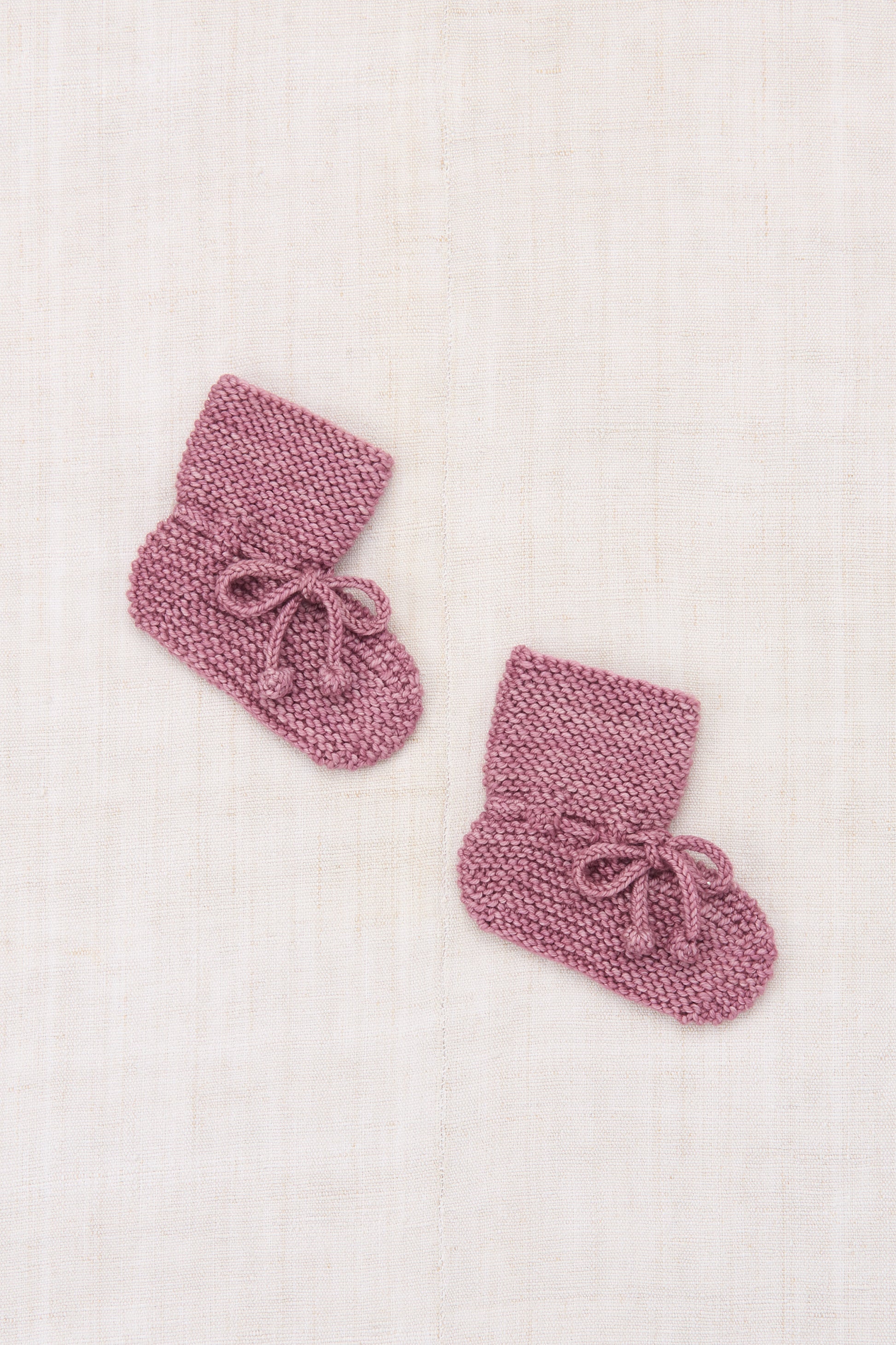 A classic hand-knit bootie set in Merino wool, with popcorn ties at the ankle for a secure fit.