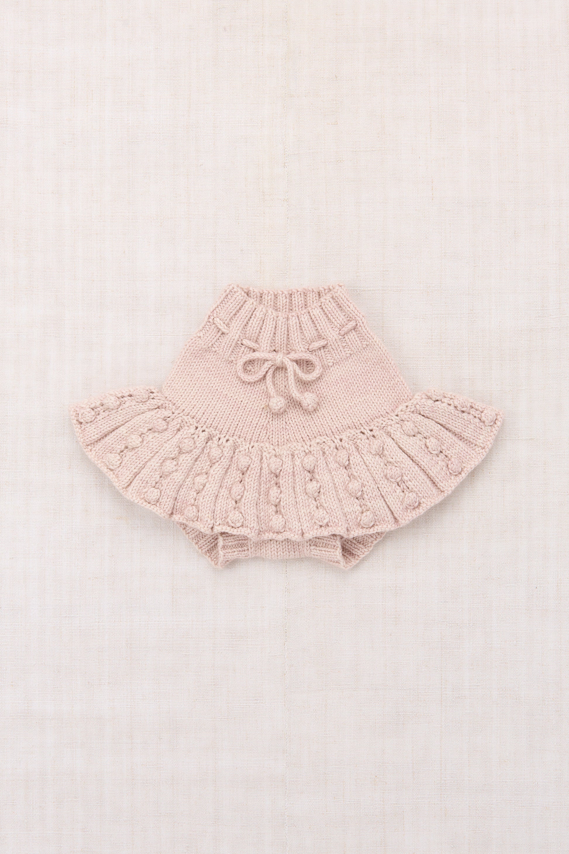 A hand-knit skirt in Merino wool, featuring attached bloomers with ribbed cuffs, eyelet popcorn stitch details, and a ribbed waistband with a popcorn-tie drawstring for a secure fit.