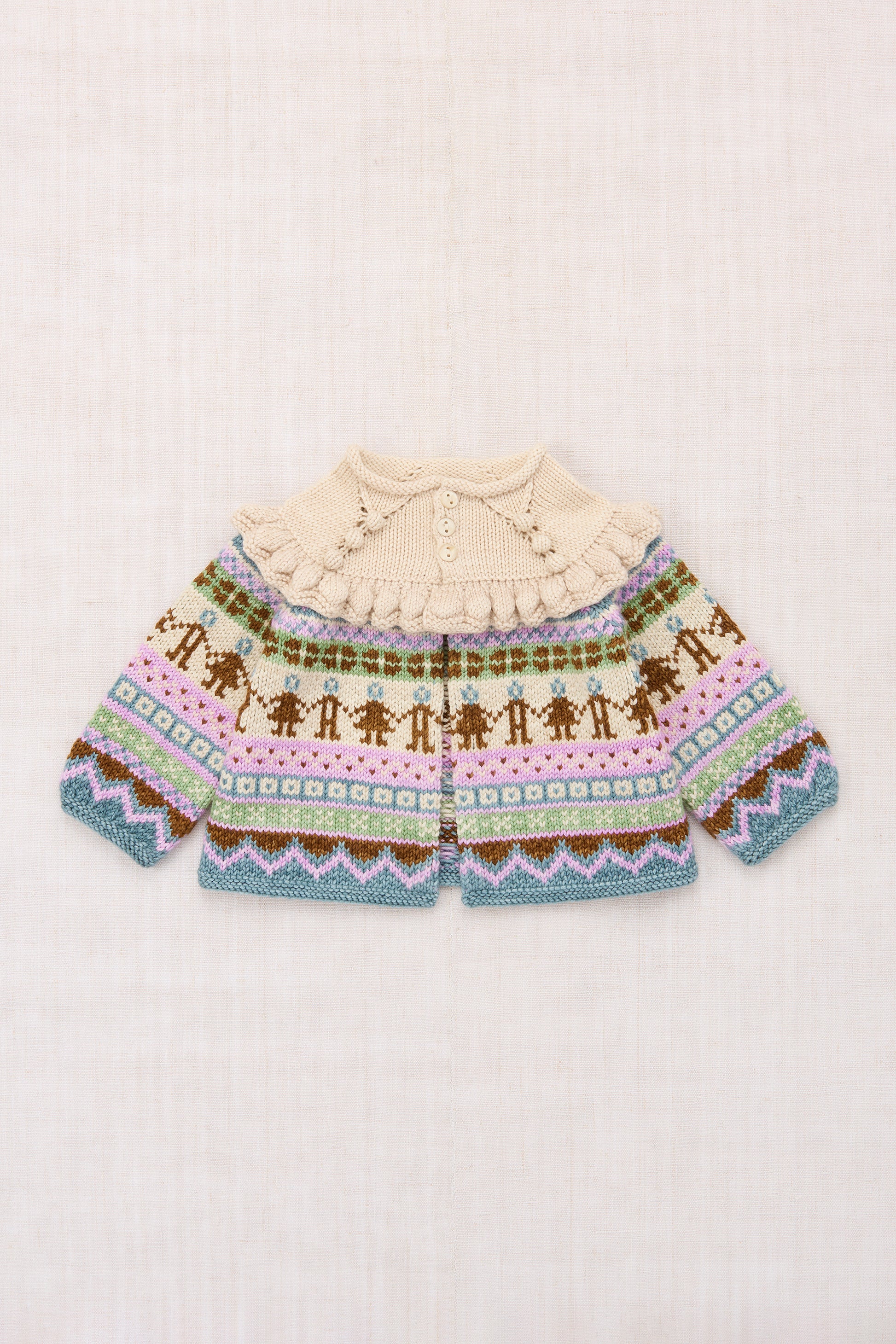A three-button cardigan in Merino wool, featuring a Fair Isle-inspired colorwork motif, self-rolled mock neck, open A-line silhouette, elaborate yoke, and a ruffle that extends the full length of the top. With eyelet and popcorn stitch detailing, bracelet-length sleeves, garter stitch cuffs and hem, and horn button closure.