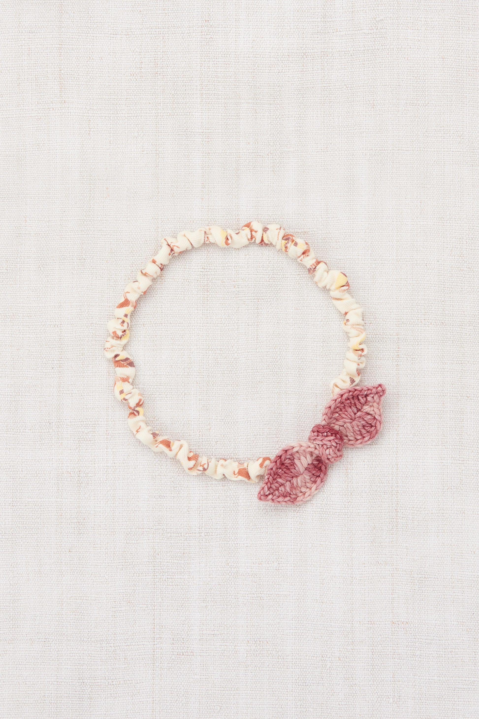 A headband featuring a sweet hand-knit leaf motif in Merino wool and an attached covered elastic band.