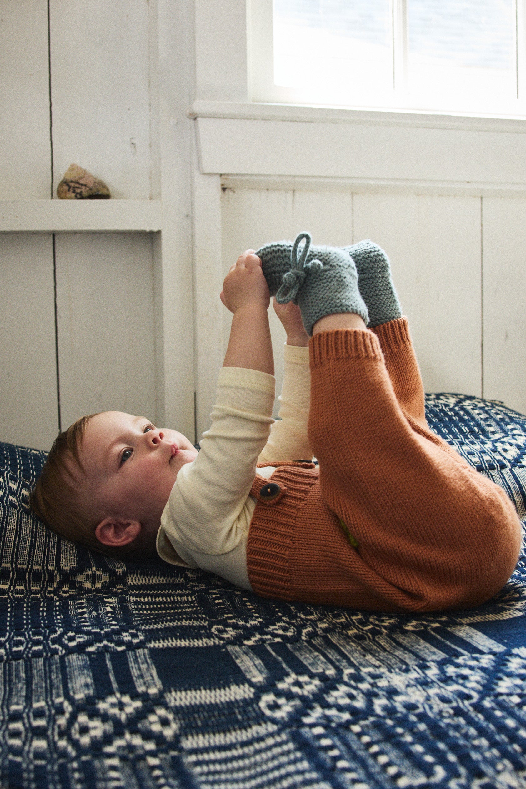 A cozy overall in a Merino wool knit, featuring a high-waisted and roomy body, ribbed waist and cuffs to keep out the cold, and adjustable straps with horn button closure. Finished with hand-crocheted motifs on the front. Perfect for layering over a onesie or knit top.