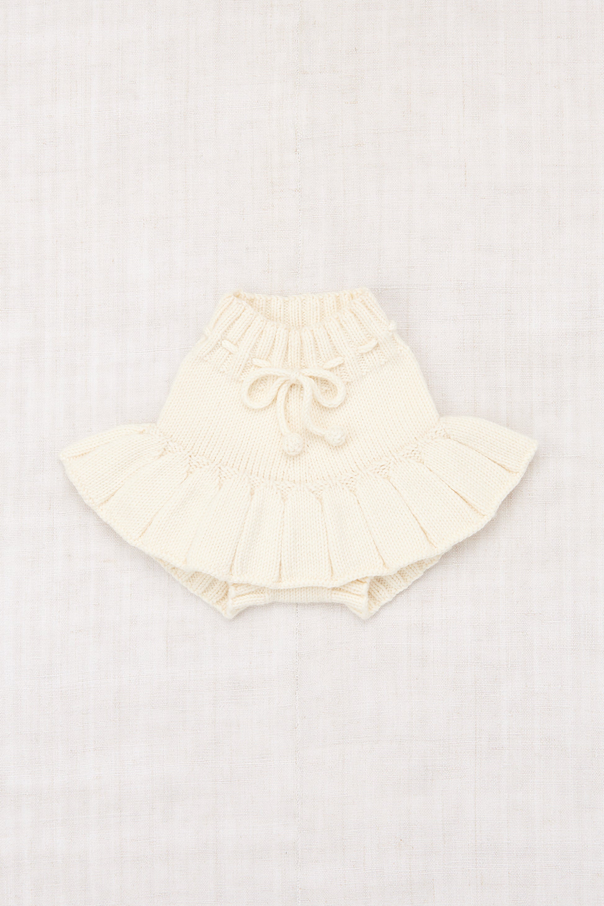A hand-knit skirt in Merino wool, featuring attached bloomers with ribbed cuffs and a ribbed waistband with a popcorn tie drawstring for a secure fit.