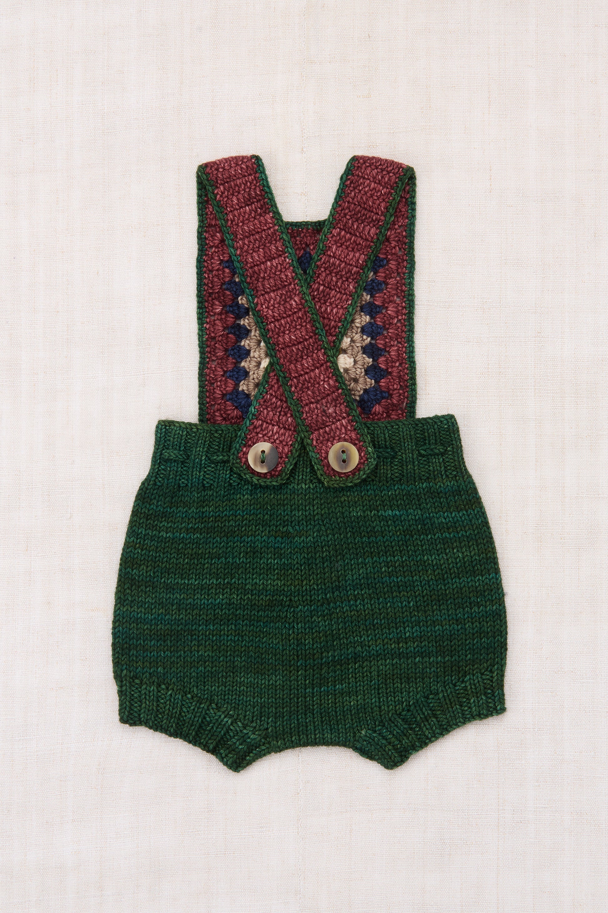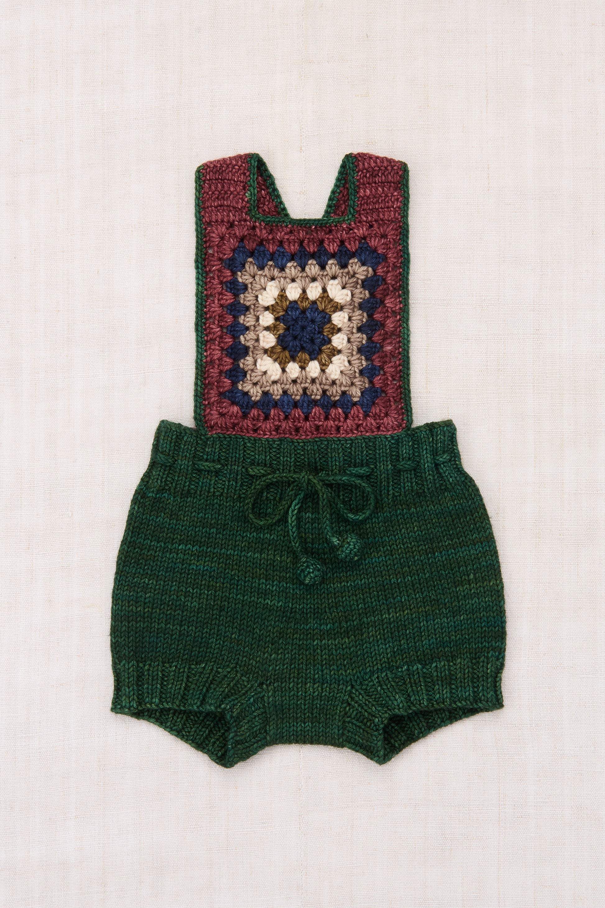 A cozy romper in Merino wool, featuring hand-crocheted granny square detail, square neckline, ribbed cuffs, ribbed popcorn-tie drawstring waist, and adjustable horn button closure on the back.