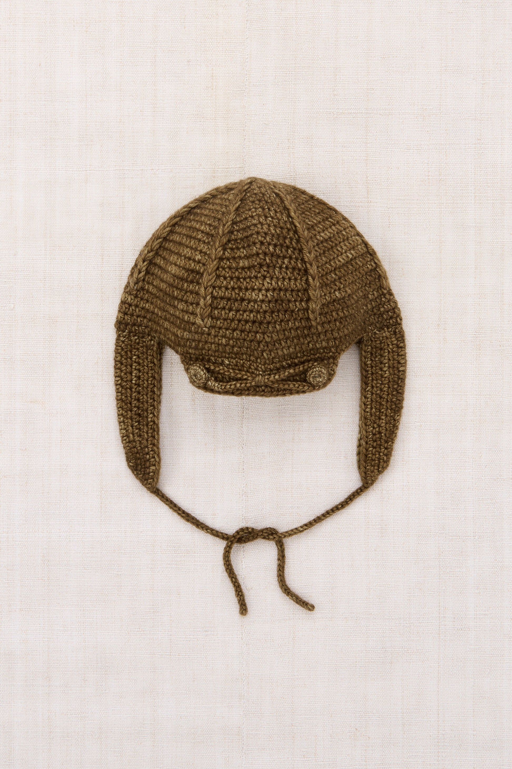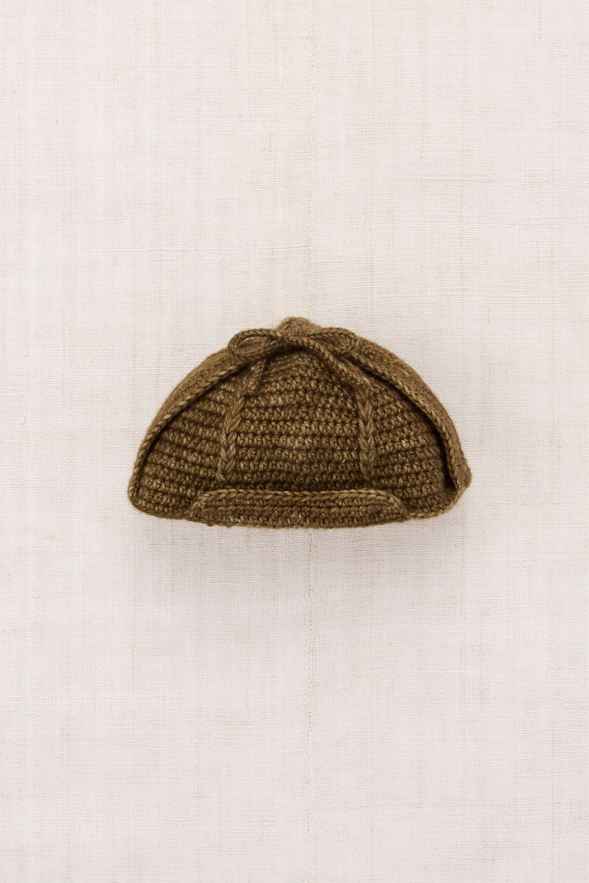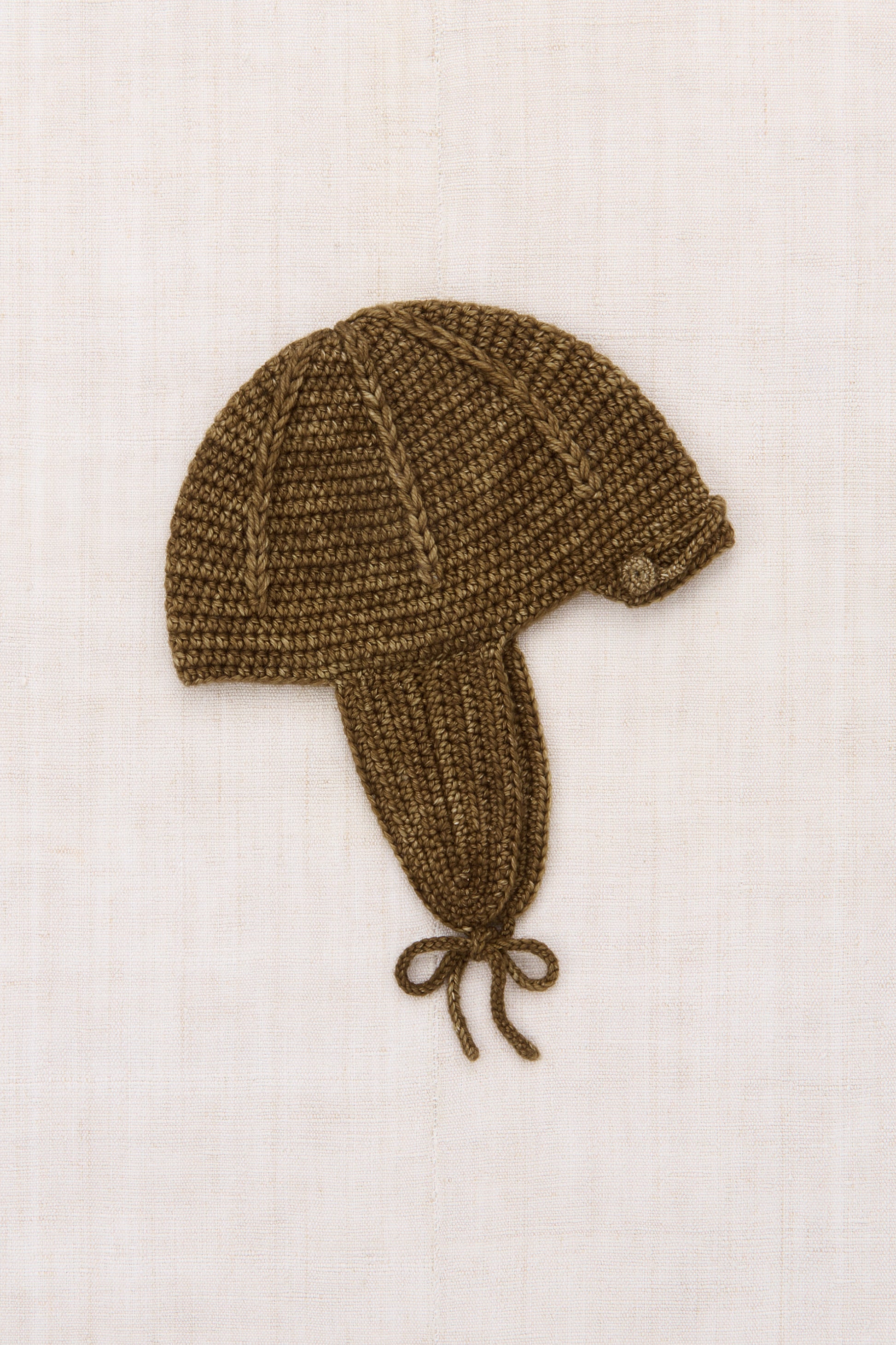 A hand-crocheted trapper-style hat in Merino wool, featuring a short brim with crochet buttons that can be worn down or folded up, and ear flaps with ties that fasten at the chin or on top.