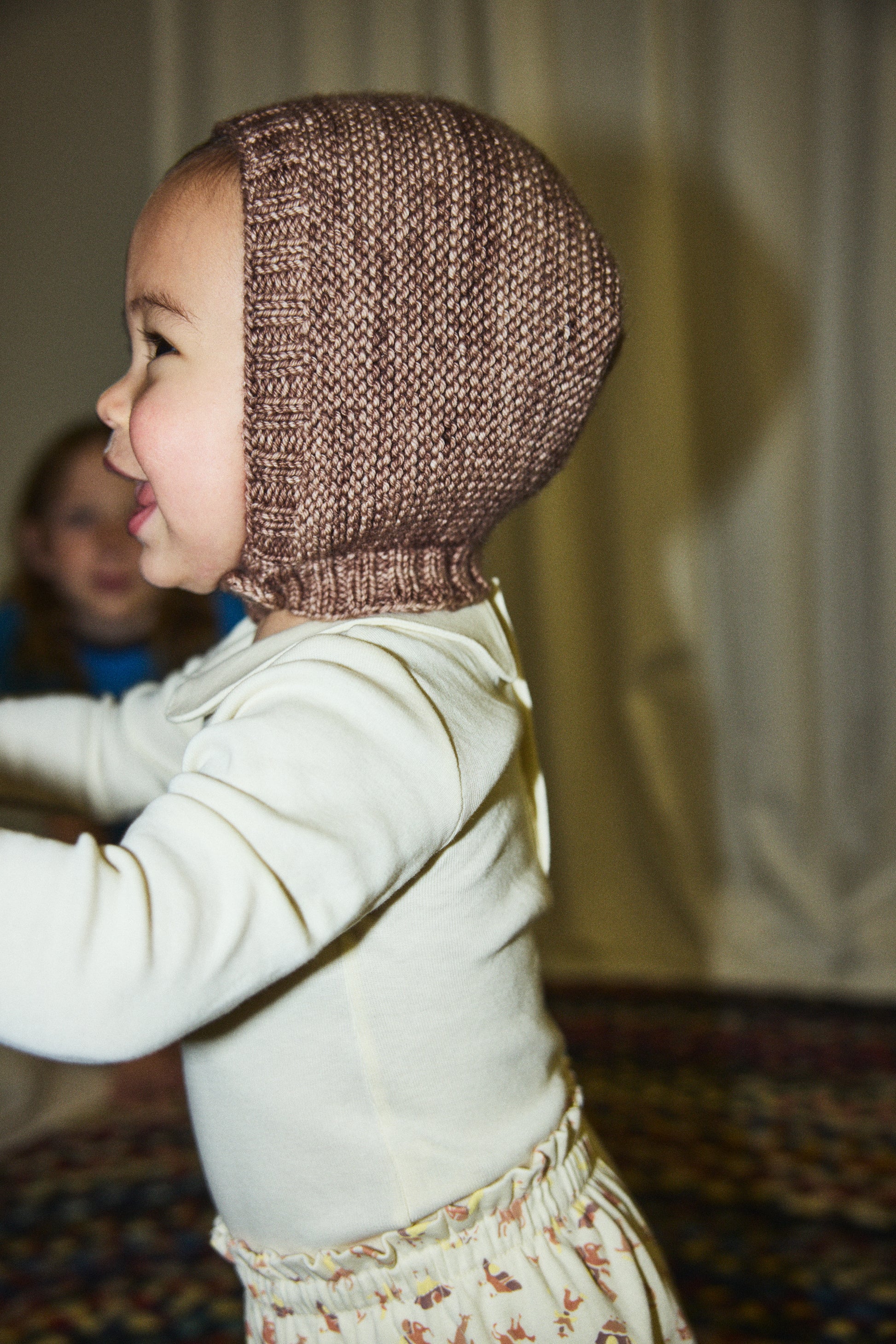 A hand-knit bonnet hood in Merino wool, featuring ribbed trim and a horn button closure at the neck for a secure fit.