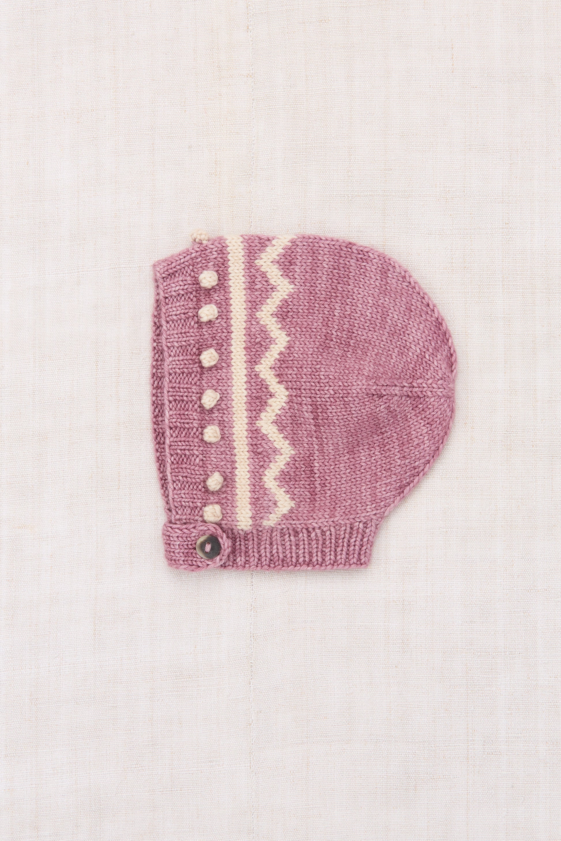 A hand-knit bonnet hood in Merino wool, featuring hand-worked popcorn stitch detail, a zig zag motif, ribbed trim, and a horn button closure at the neck for a secure fit.