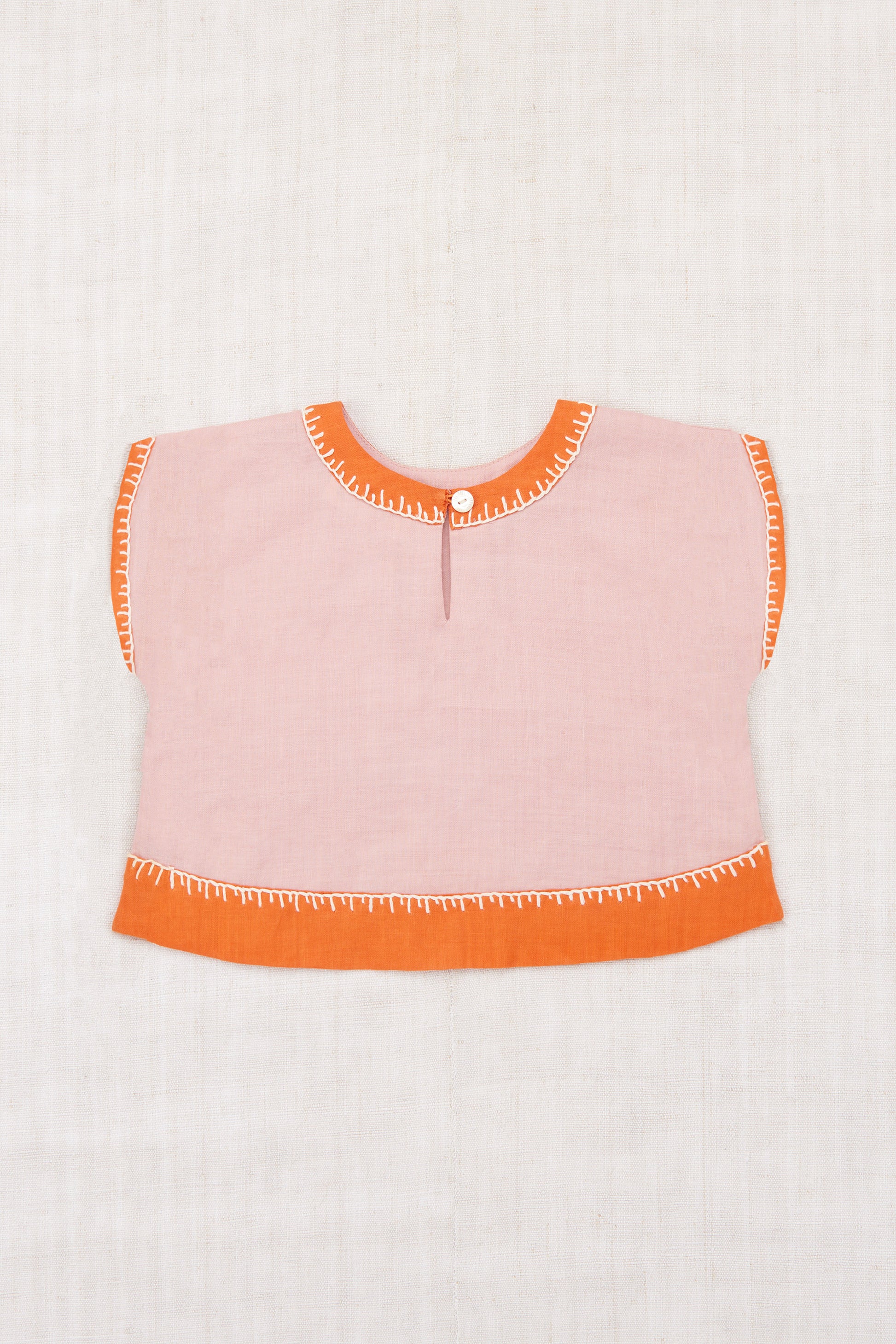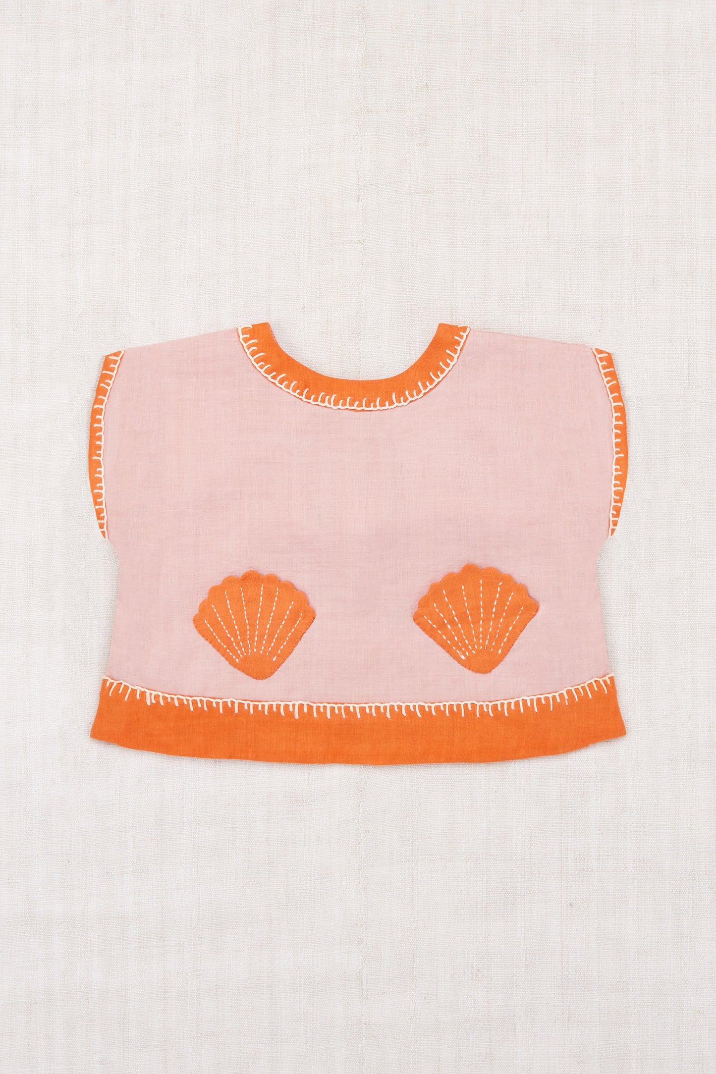A top in woven linen, featuring hand-applied seaside appliqué shell pockets with hand-embroidered details, contrast trim with blanket-stitch embroidered details, and keyhole shell button closure on the back. Finished with French seams.