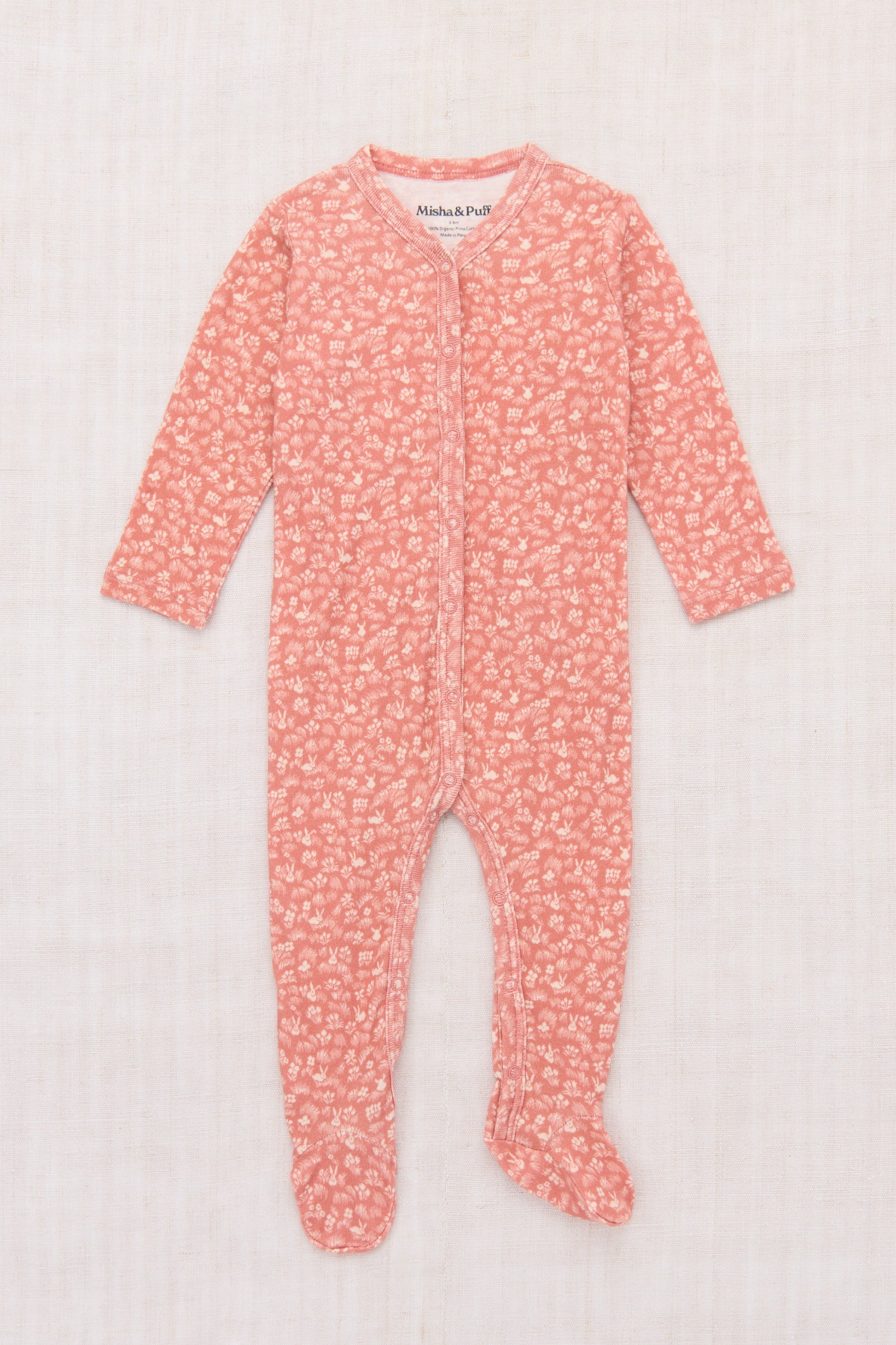 A long-sleeved one-piece in soft organic Pima cotton, with snap closure down the front and attached feet — for sleep and play.