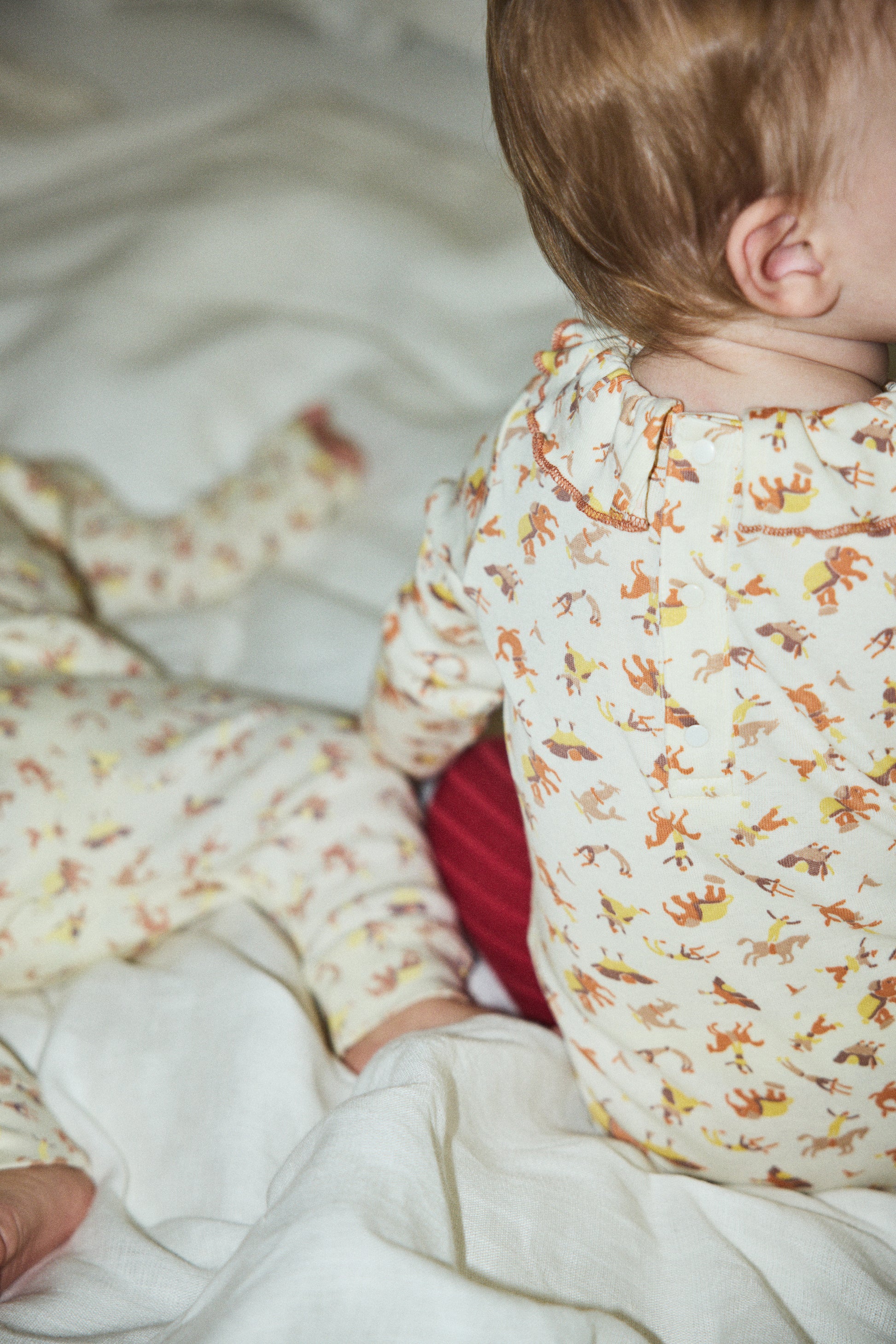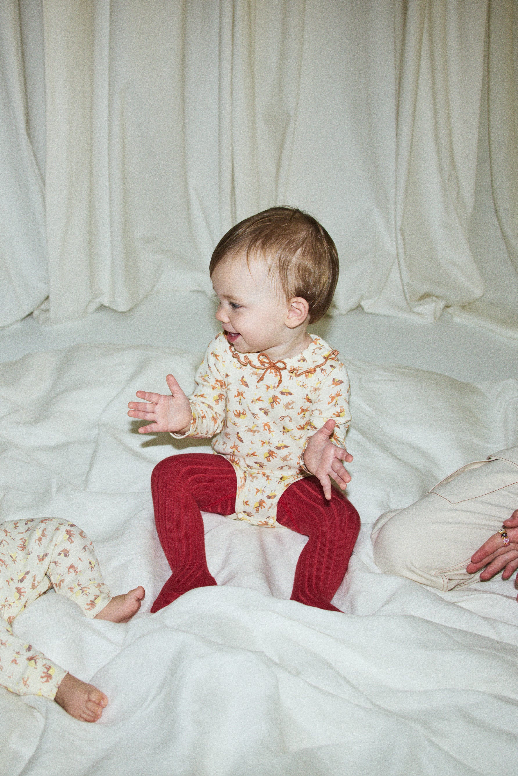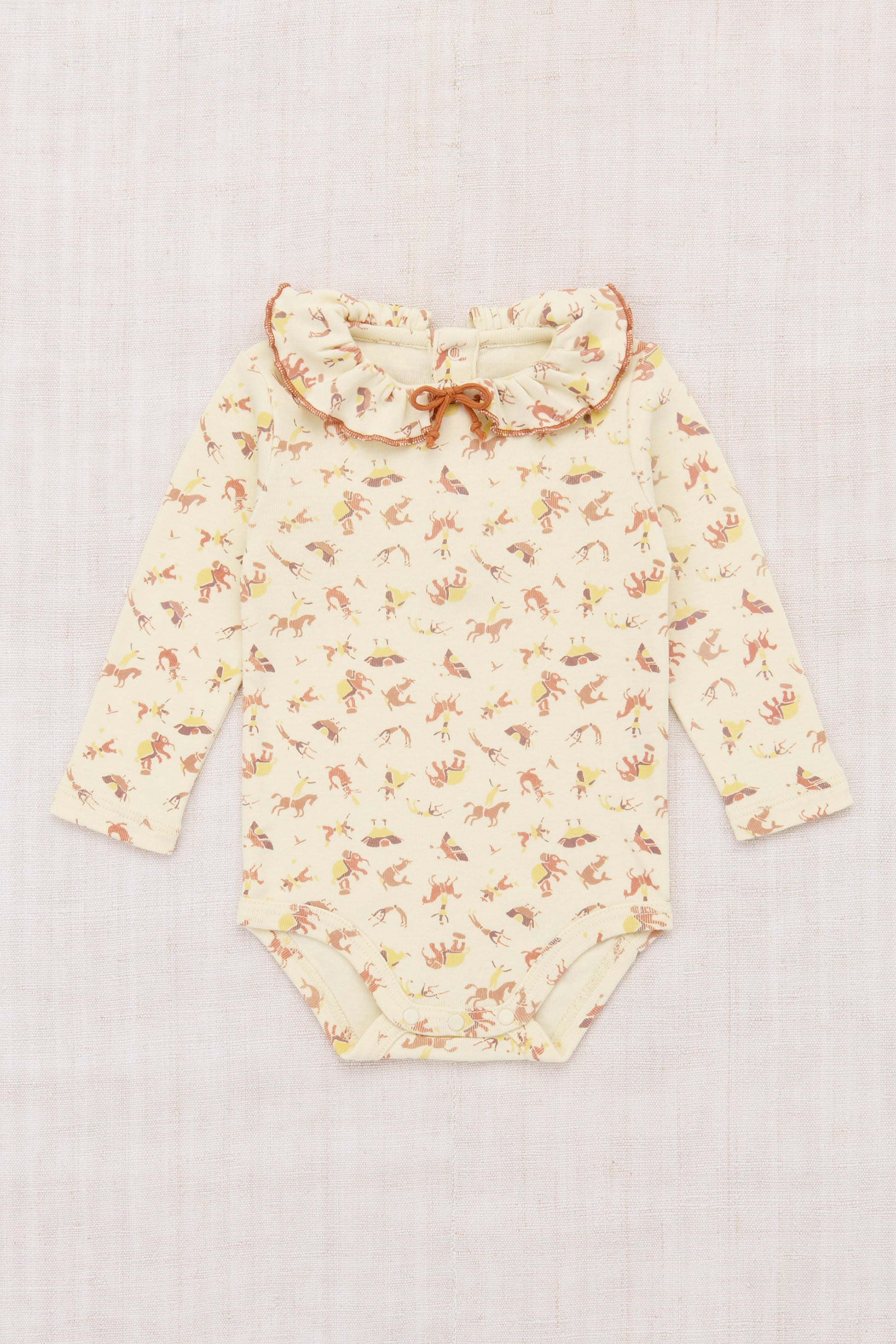 A long-sleeved onesie in organic Pima cotton, featuring a ruffle collar with a contrast merrowed edge and mini bow. Finished with snap closure at the bottom and back neck — perfect on its own or layered for a versatile, buildable look.