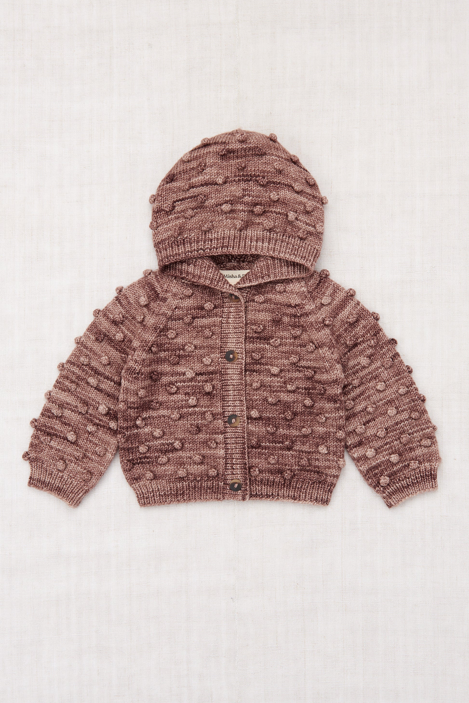 A roomy hand-knit hooded cardigan in our signature all-over popcorn stitch. Featuring a cozy silhouette, a bonnet-style hood with a slight point at the top, ribbed trim and hem, and horn button closure.
