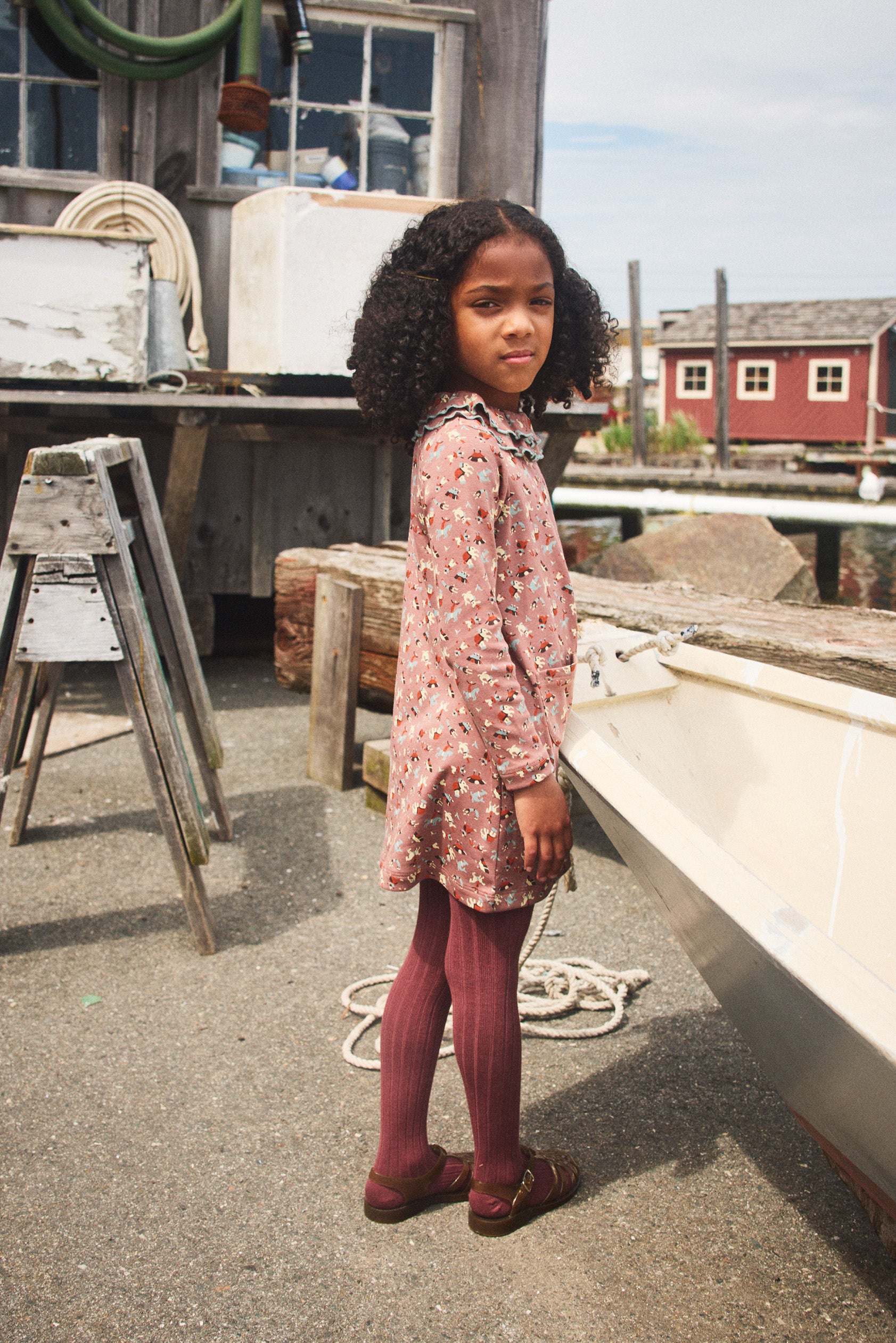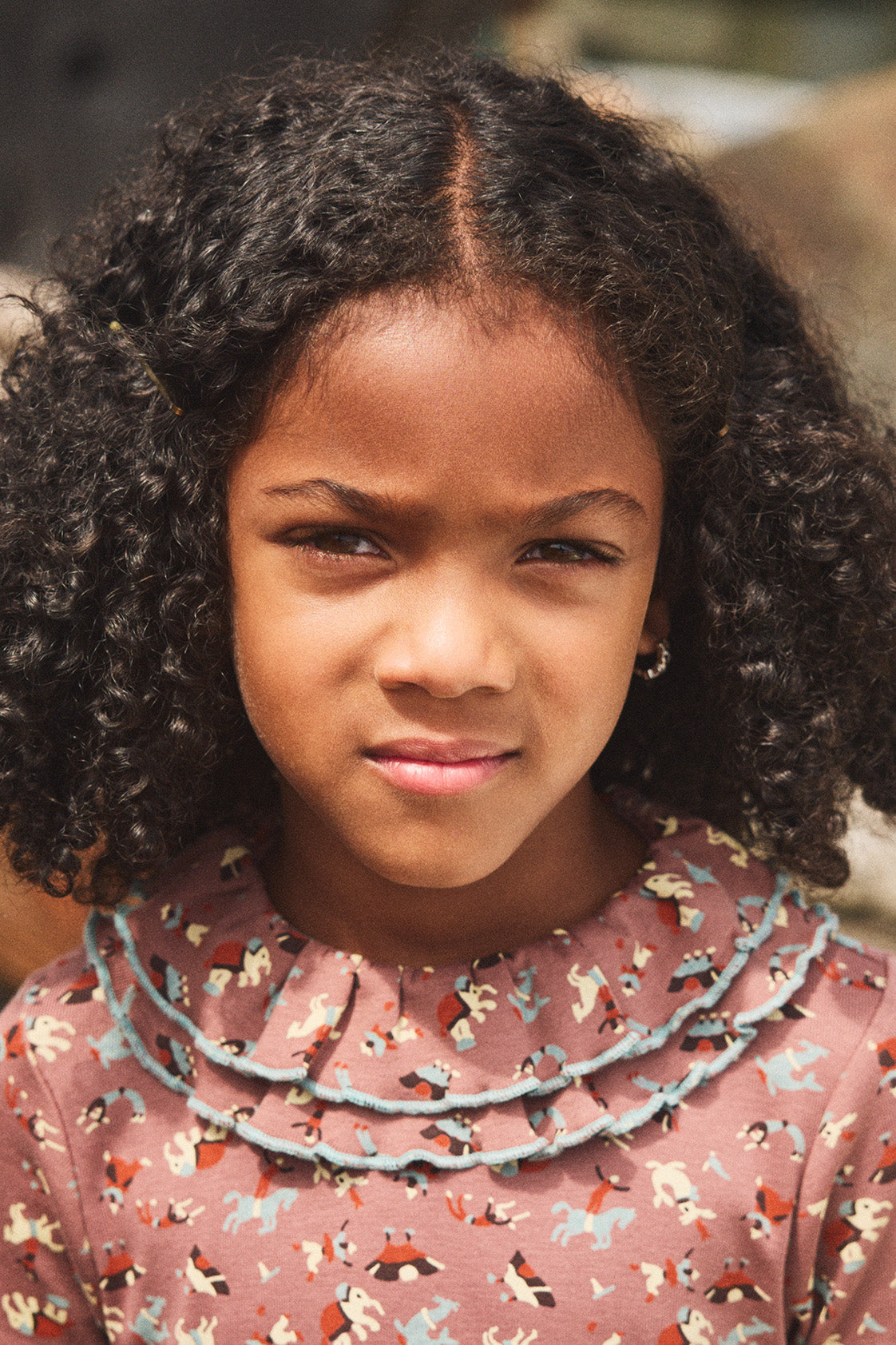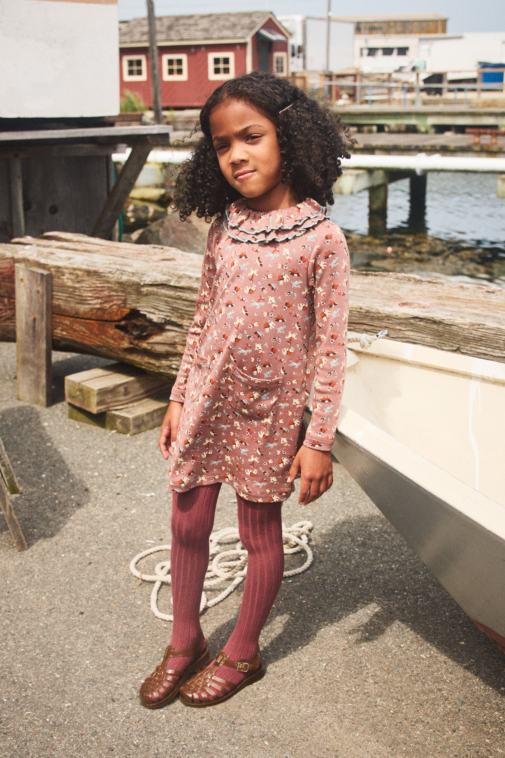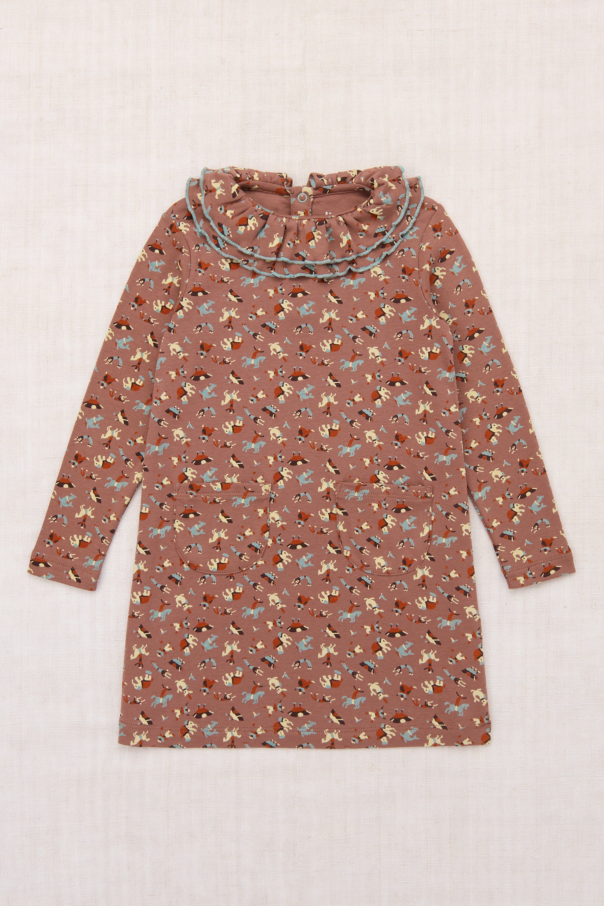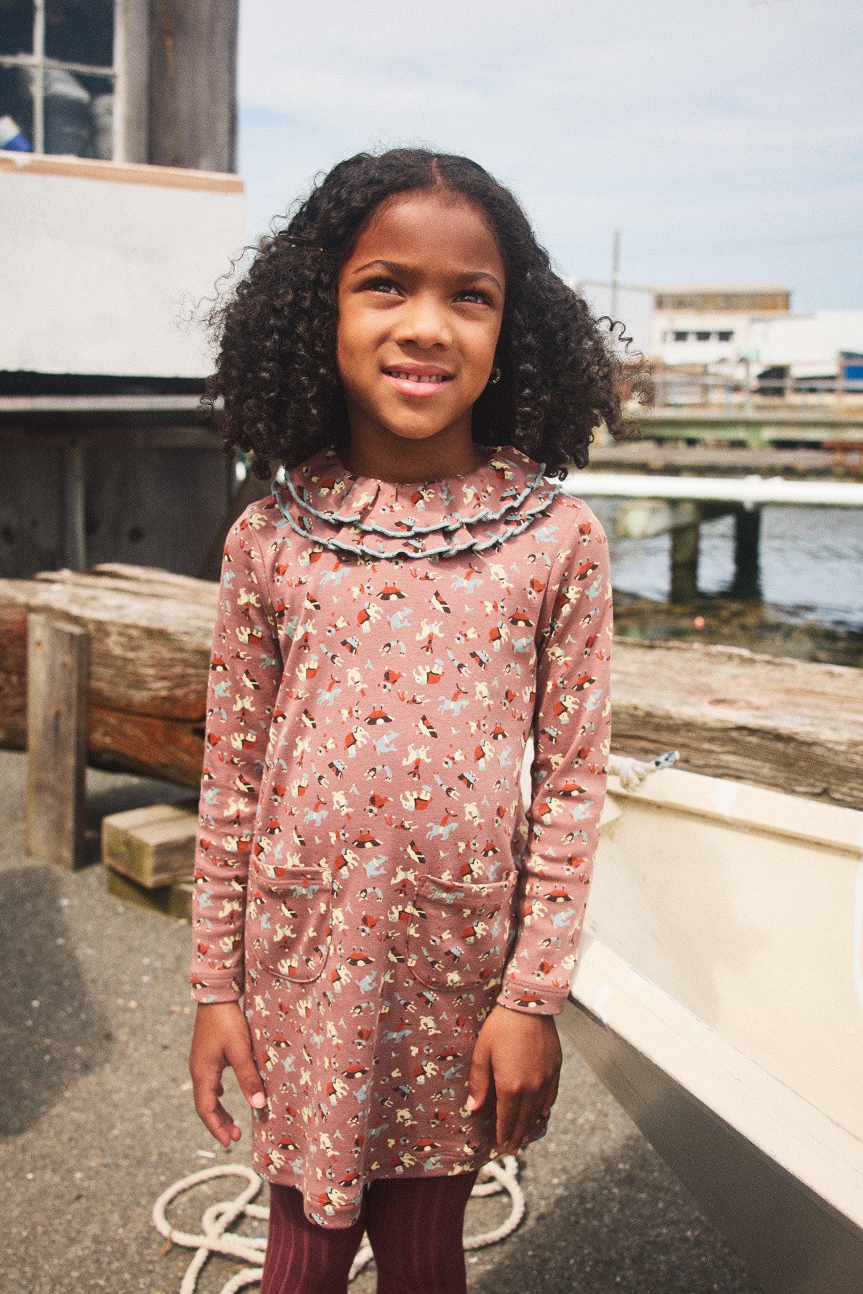 A swingy long-sleeved dress in organic Pima cotton, featuring two rows of gathered ruffles at the neck and a soft elastic wrist ruffle with contrast merrowed edge, and two front patch pockets.