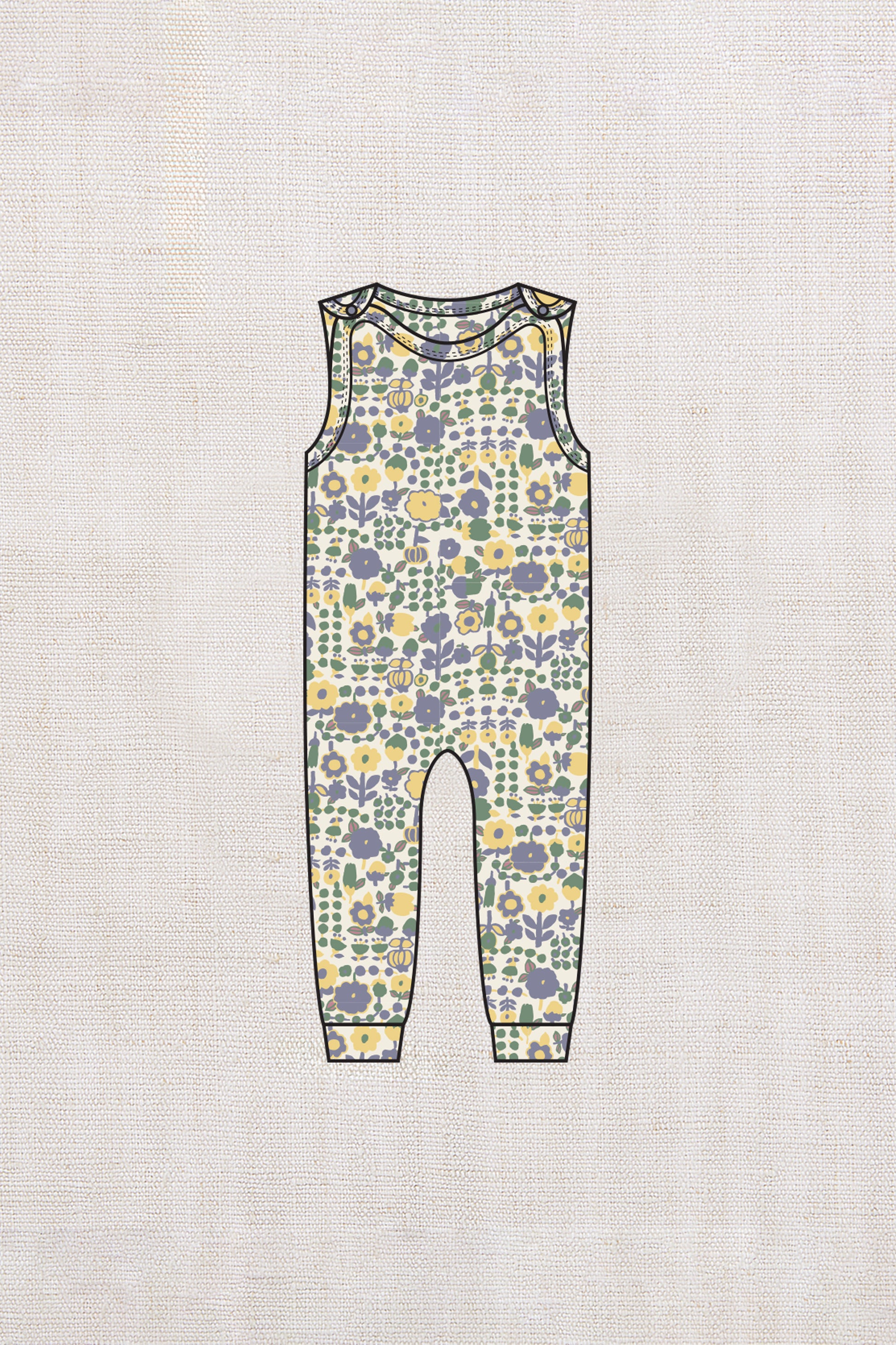 A sleeveless overall onesie in organic Pima cotton, featuring snap closures at the shoulder and cuffs at the hem.