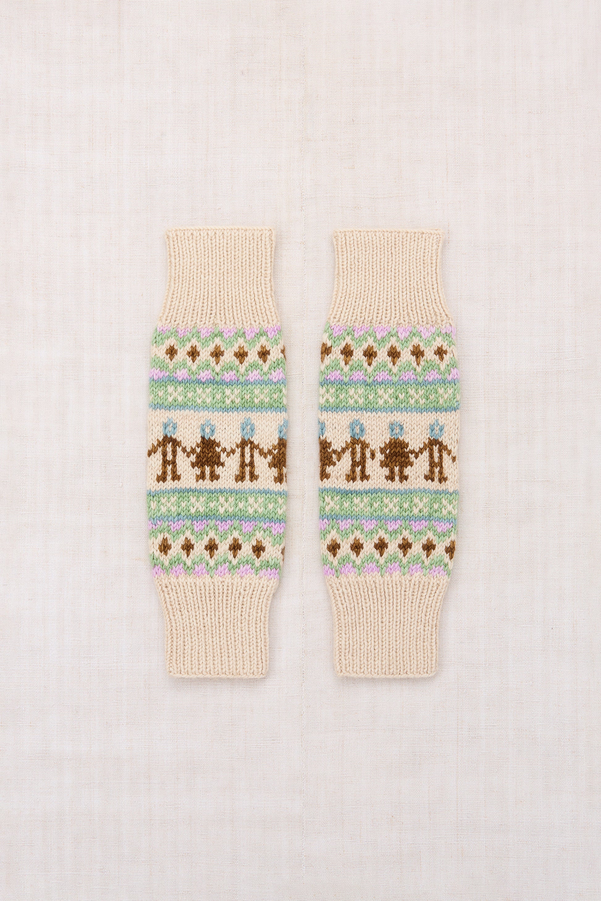 A hand-knit legwarmer in Merino wool, featuring ribbed trim and a Fair Isle–inspired colorwork motif. A cold-weather staple that brings warmth and style to any look — perfect for layering over pants or tights, or pairing with a skirt.
