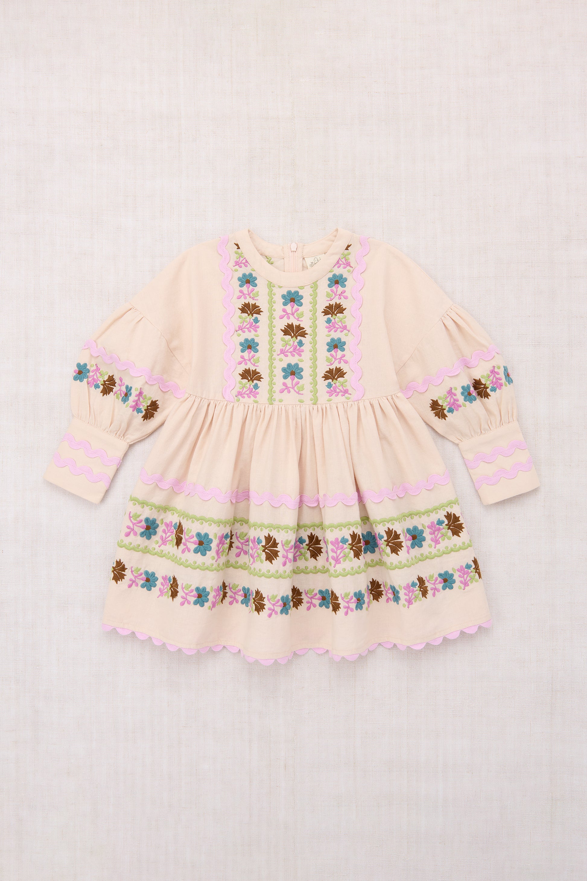 A statement dress in rustic cotton linen, featuring contrast ric rac and linear embroidery design at chest, sleeves, skirt and hem. Priscilla’s retro silhouette features a full skirt, dropped shoulders and deep cuffs. Zip closure at back.