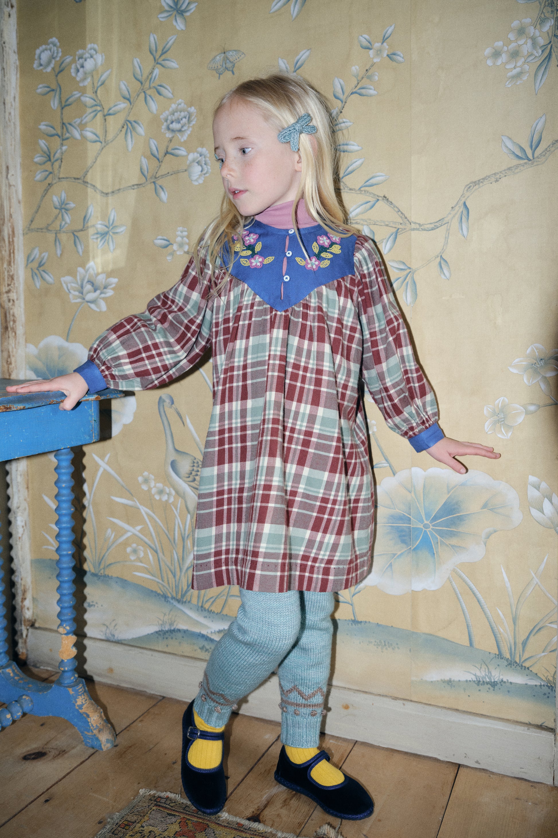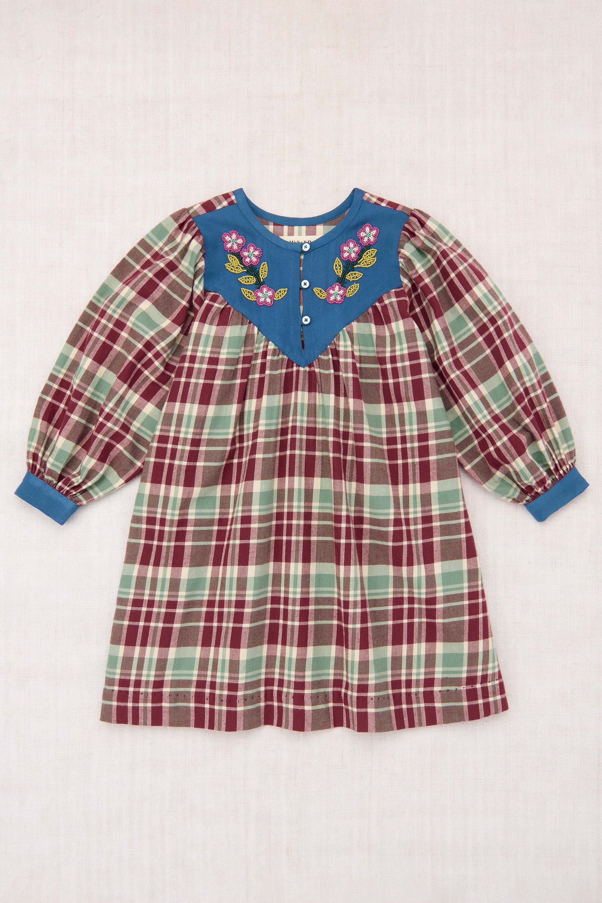 A long-sleeved dress in woven cotton flannel, slightly brushed for a soft feel, featuring a western-style yoke with hand-beaded glass motifs, a rounded collar, and blouson sleeves with contrast cuffs. Finished with corozo button closure and French seams.