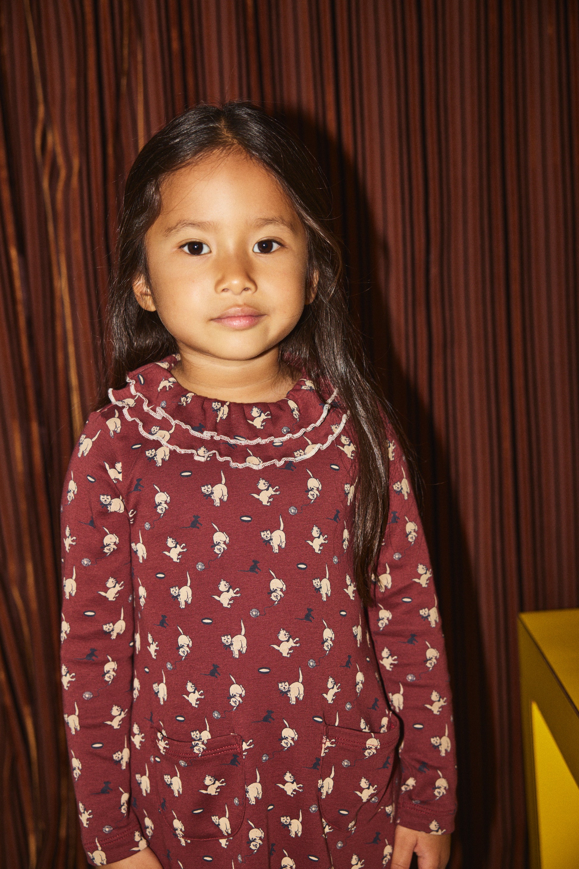 A swingy long-sleeved dress in organic Pima cotton, featuring two rows of gathered ruffles at the neck and a soft elastic wrist ruffle with contrast merrowed edge, and two front patch pockets.