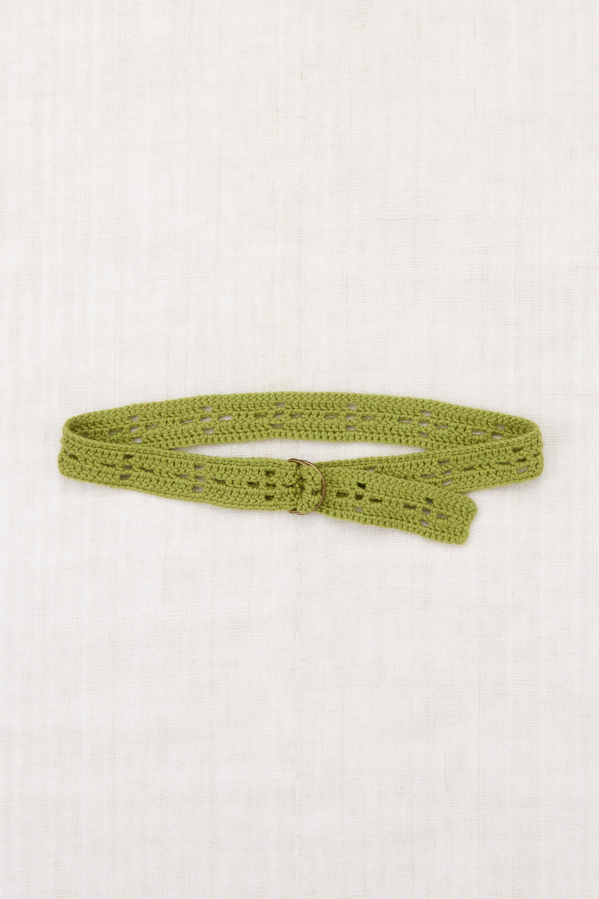 A hand-crocheted belt in Merino wool, featuring an easily adjustable d-ring buckle.