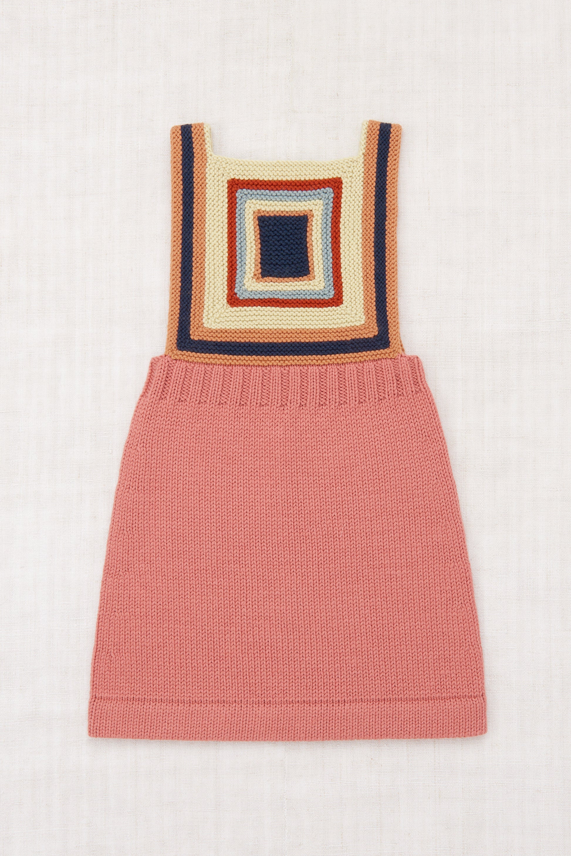 Inspired by log cabin technique, a pinafore-style dress in Merino wool. Featuring a hand-knit geometric motif, square neckline with single-strap horn button closure, ribbed waist, and a knit skirt with a slight a-line shape.