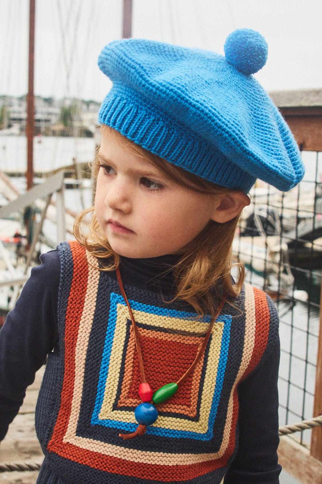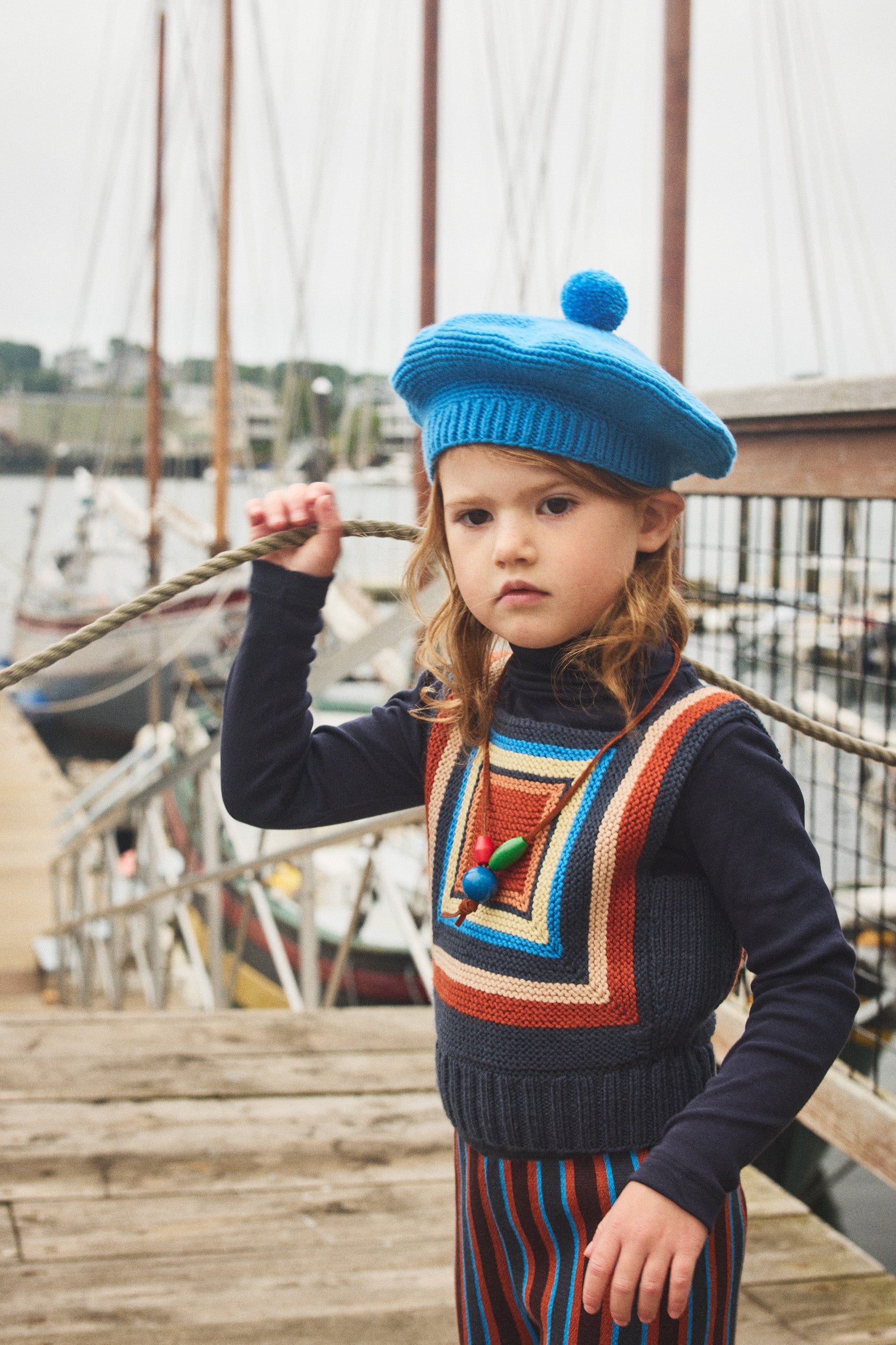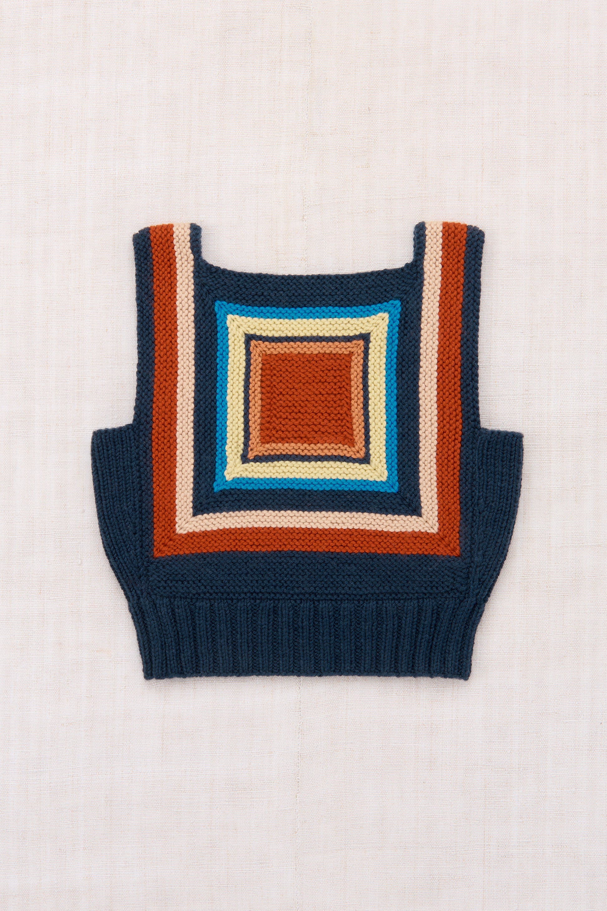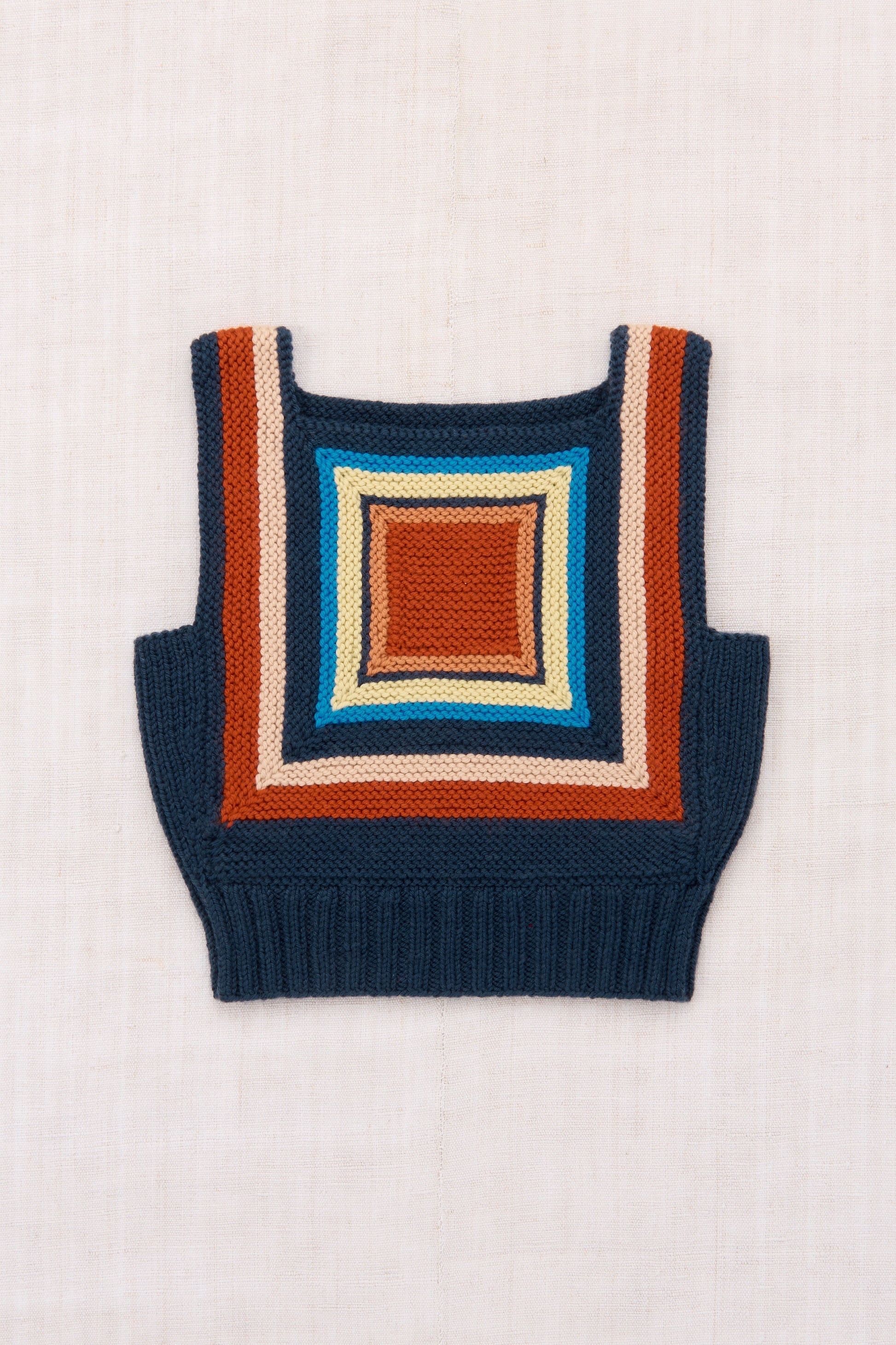 Inspired by log cabin technique, a hand-knit tank vest in Merino wool. Featuring a geometric motif on the front and back, and a ribbed hem. A show-stopping piece — perfect for layering.