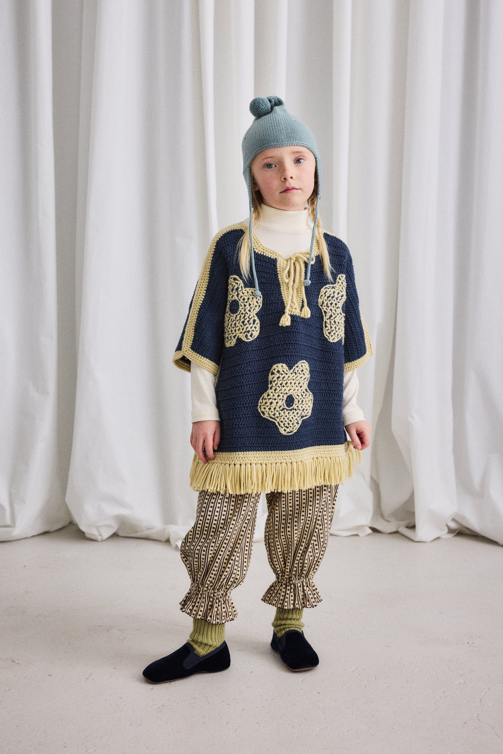 A hand-knit hat in Merino wool, with ear flaps, a stand-up pointy pom-pom top, and popcorn tie closure for a secure fit.