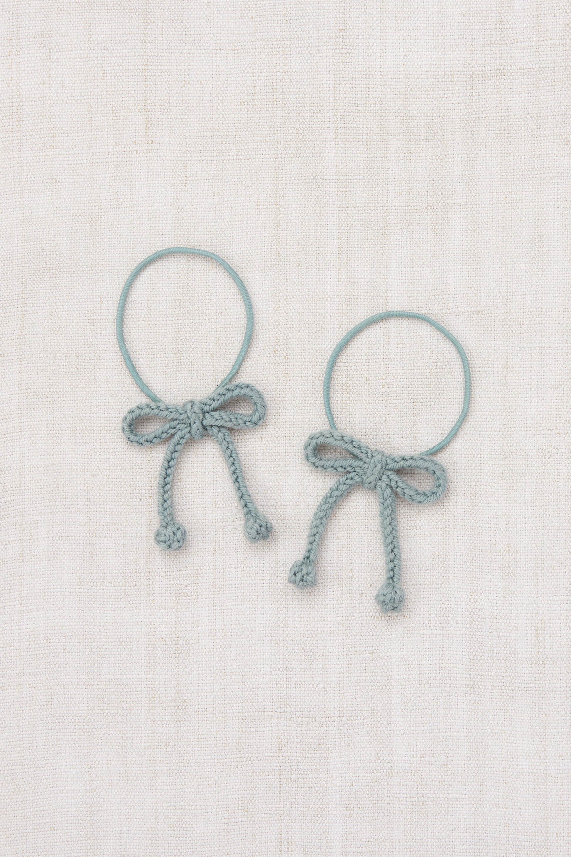A pair of hand-knit bows with popcorn detail in Merino wool, attached to elastics.
