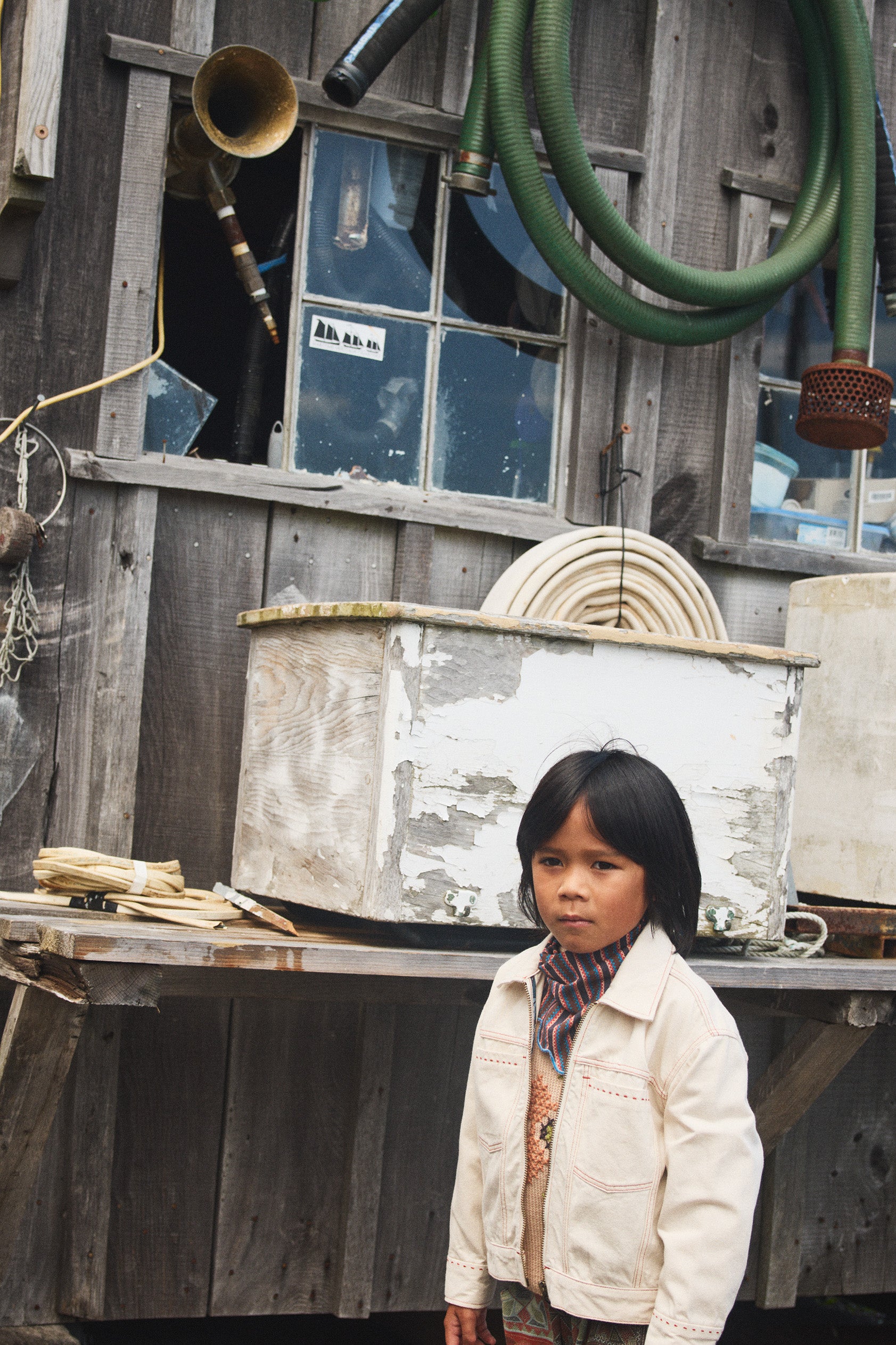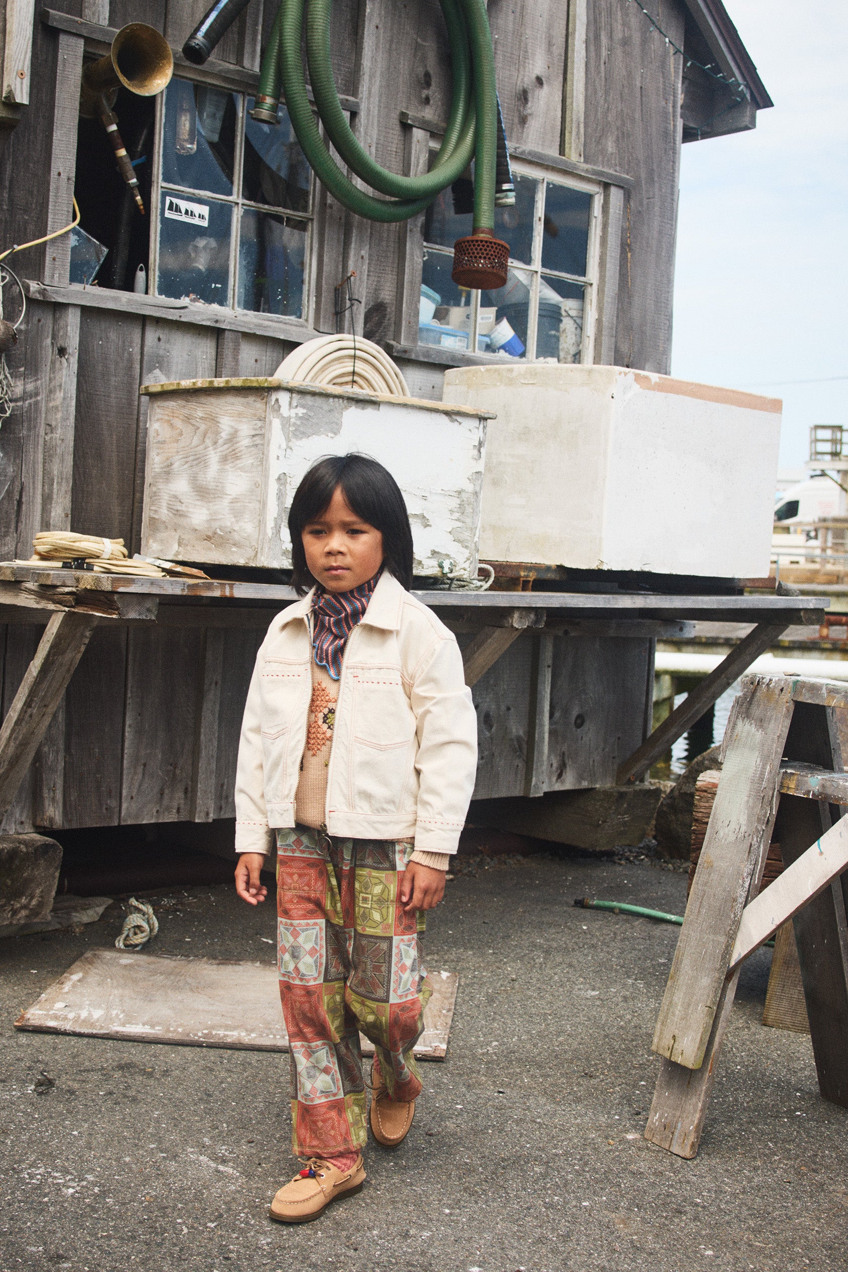 A classic vintage-inspired jacket in 100% cotton denim, with a point collar, contrast print lining and lined side slit pockets, two front patch pockets, front zip closure, and all-over contrast topstitch detail. Finished with hand-tacked stitches instead of rivets for softness.