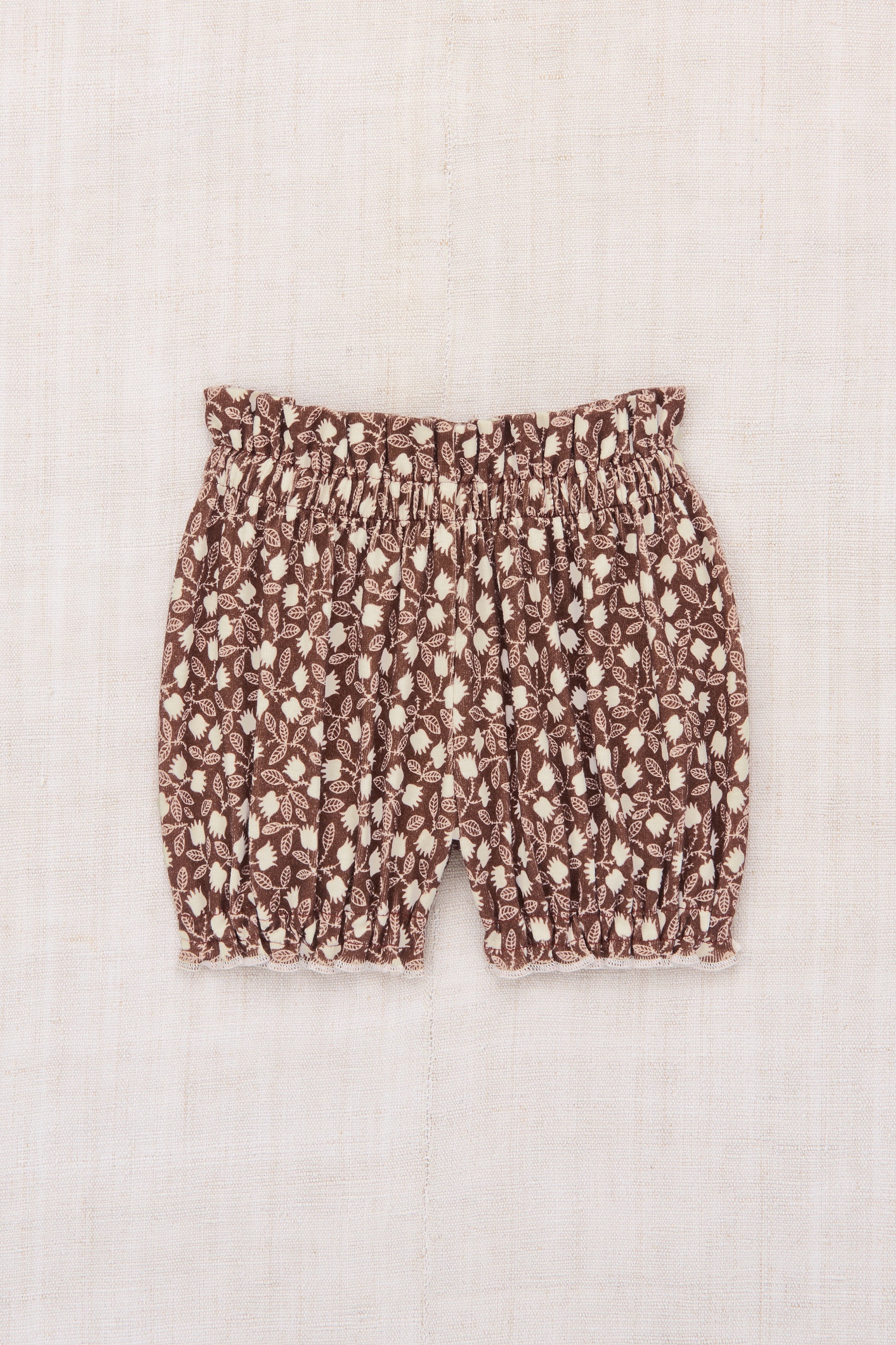 A pull-on bloomer in soft organic Pima cotton, with a cinched ruffle elastic waist and leg opening with a contrast merrowed edge.