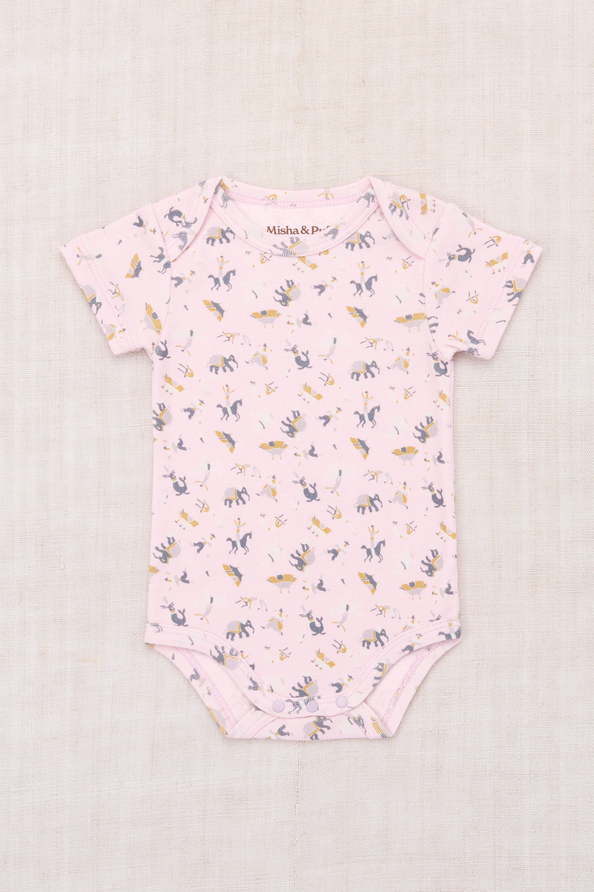 A short-sleeved onesie in soft organic Pima cotton, featuring lap-shoulder detail and snap closure at the bottom.