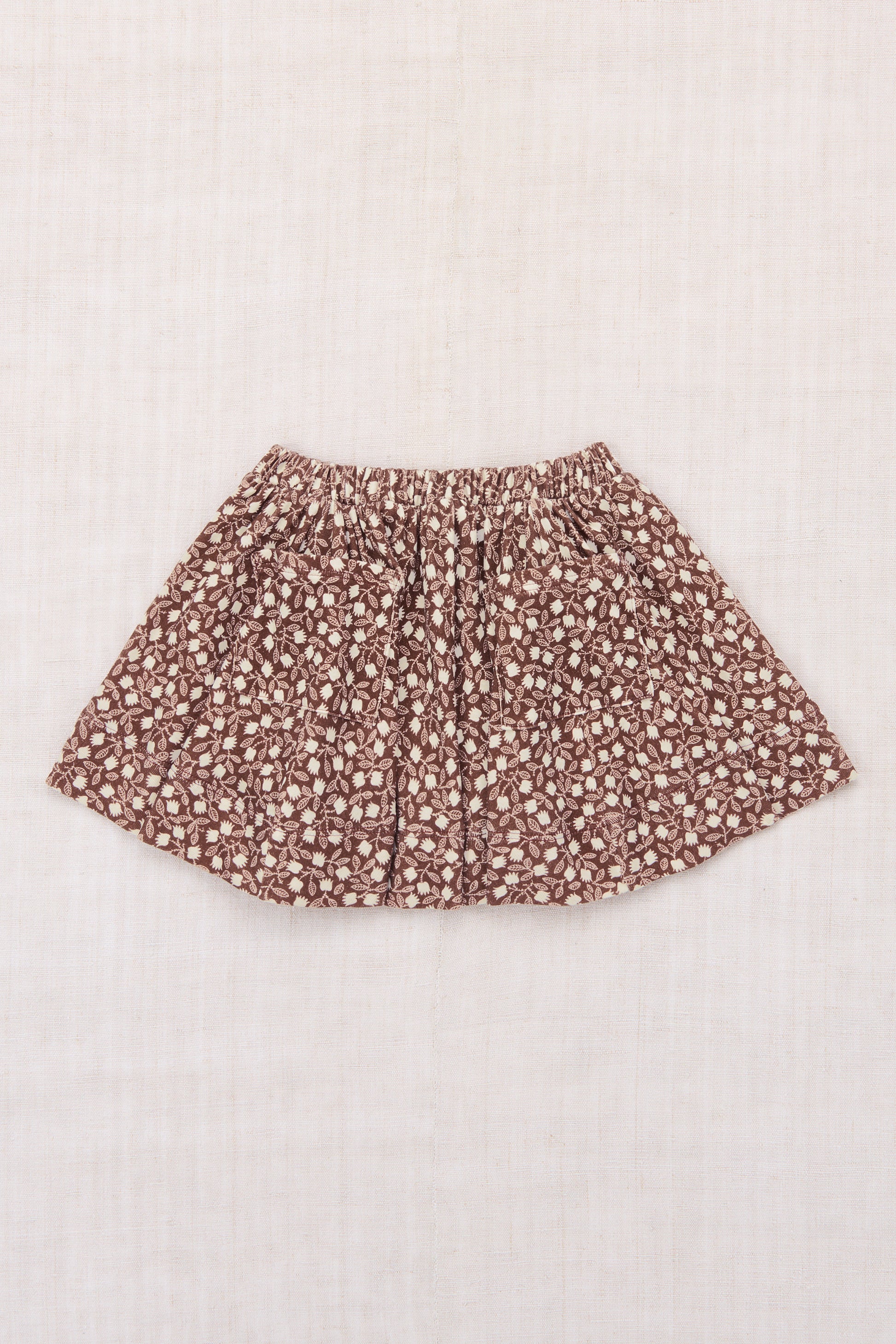A twirly pull-on skirt in organic Pima cotton, featuring a gathered elastic waistband and front patch pockets for added style and functionality.