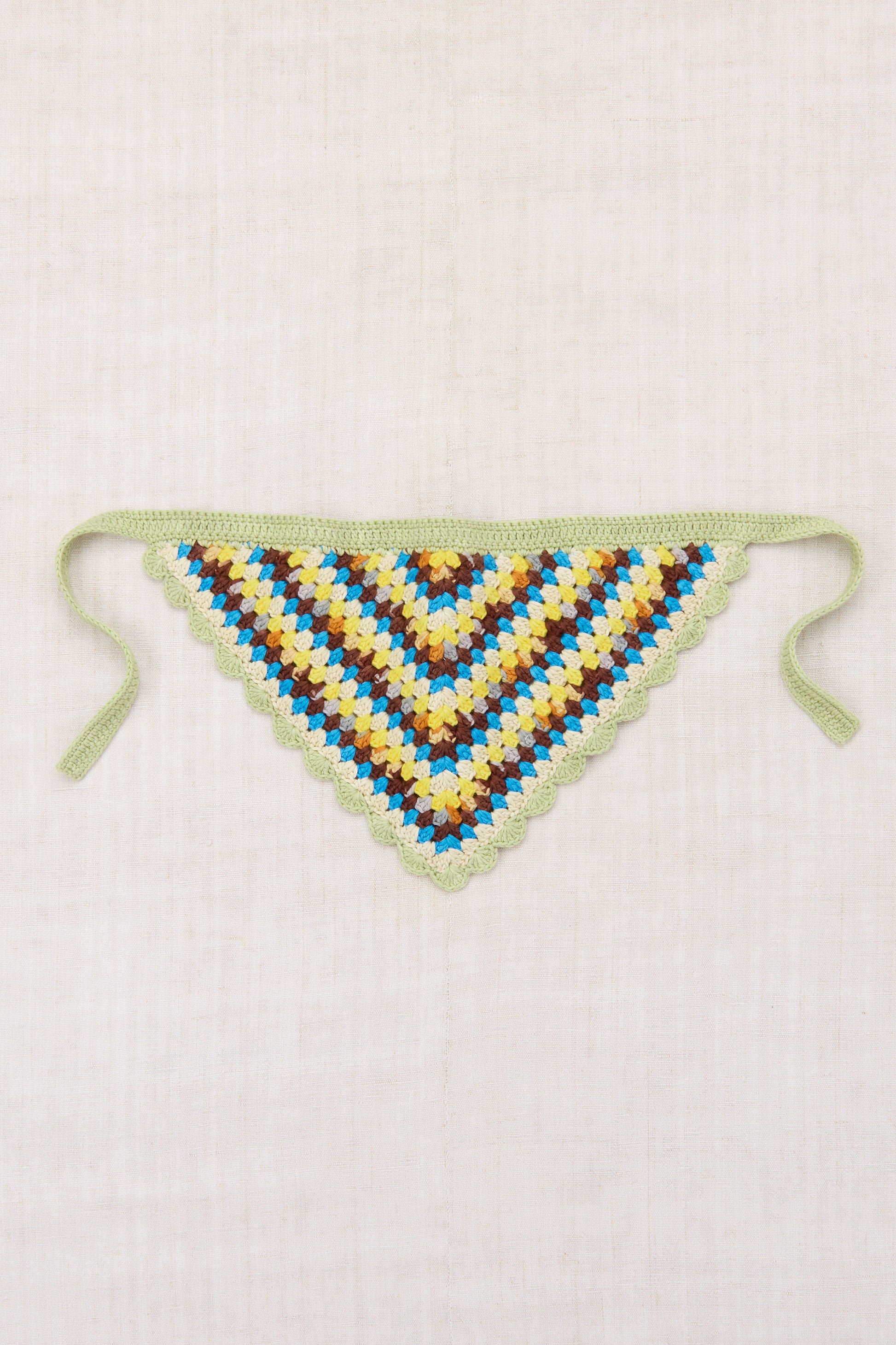 A sweet hand-crocheted scarf in Pima cotton, featuring a multi-color graphic pattern, scalloped trim, and simple tie closure.