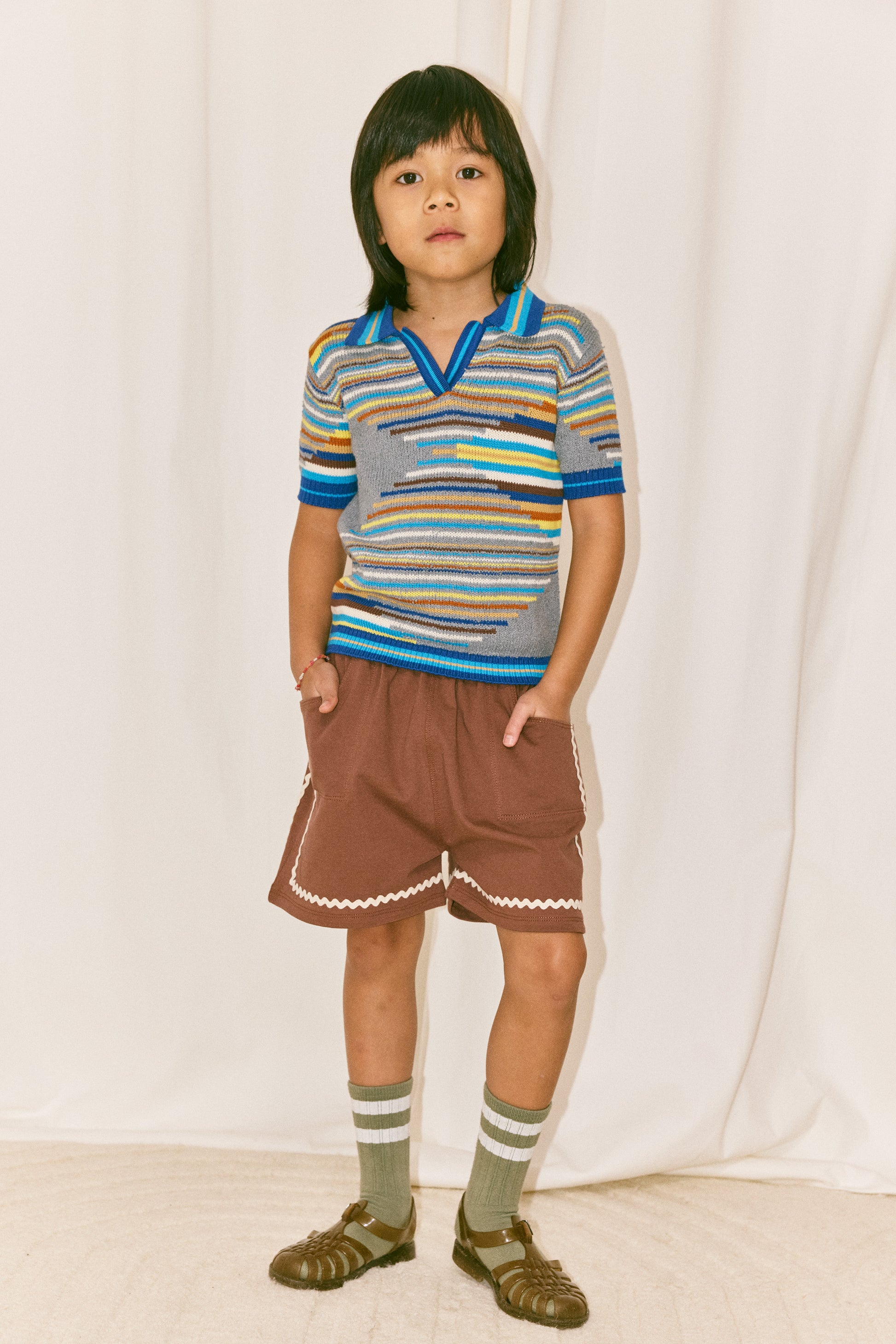 A short-sleeved polo shirt in a fine-gauge Pima and bouclé cotton blend knit, with sporty stripes on the collar and ribbed trim.