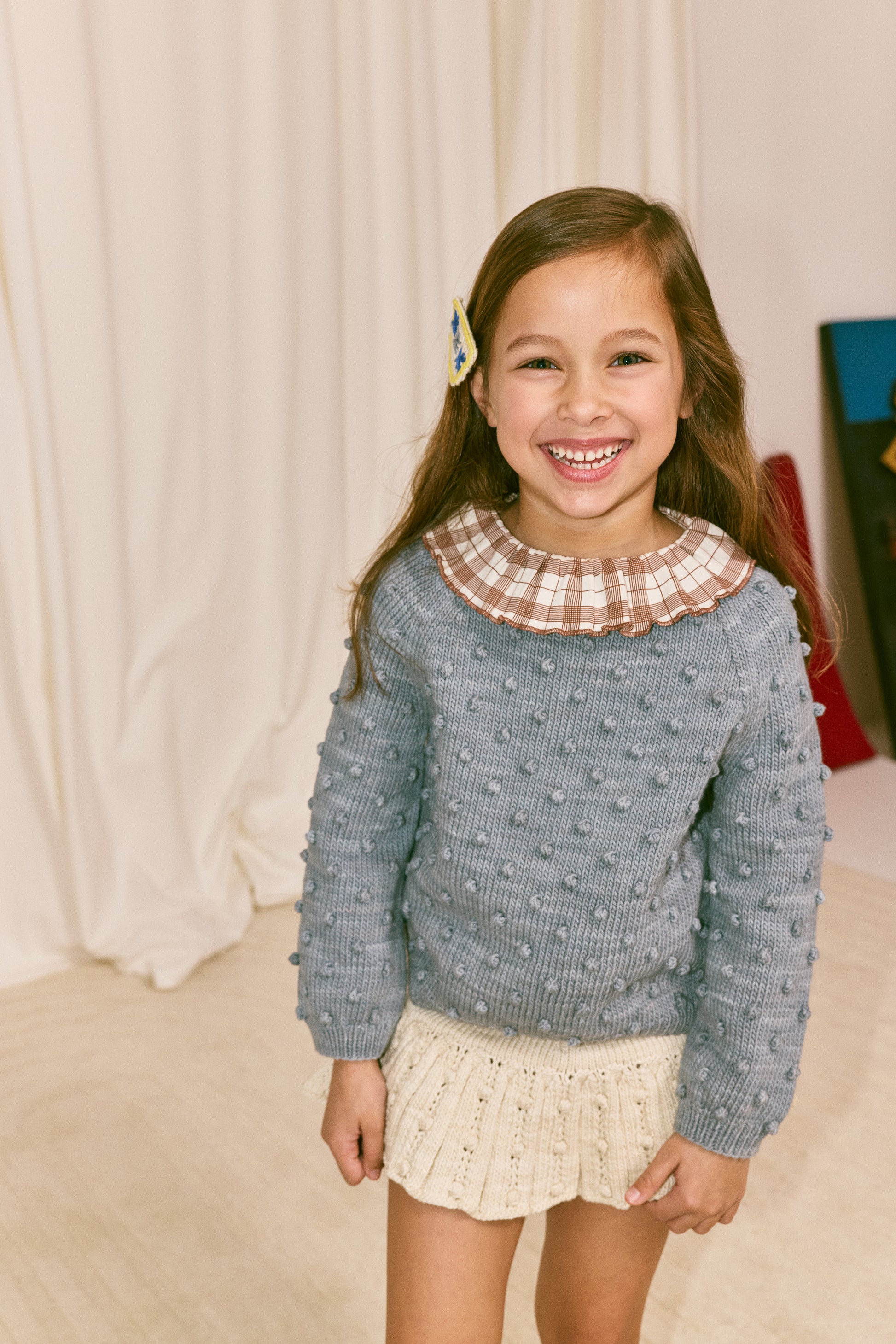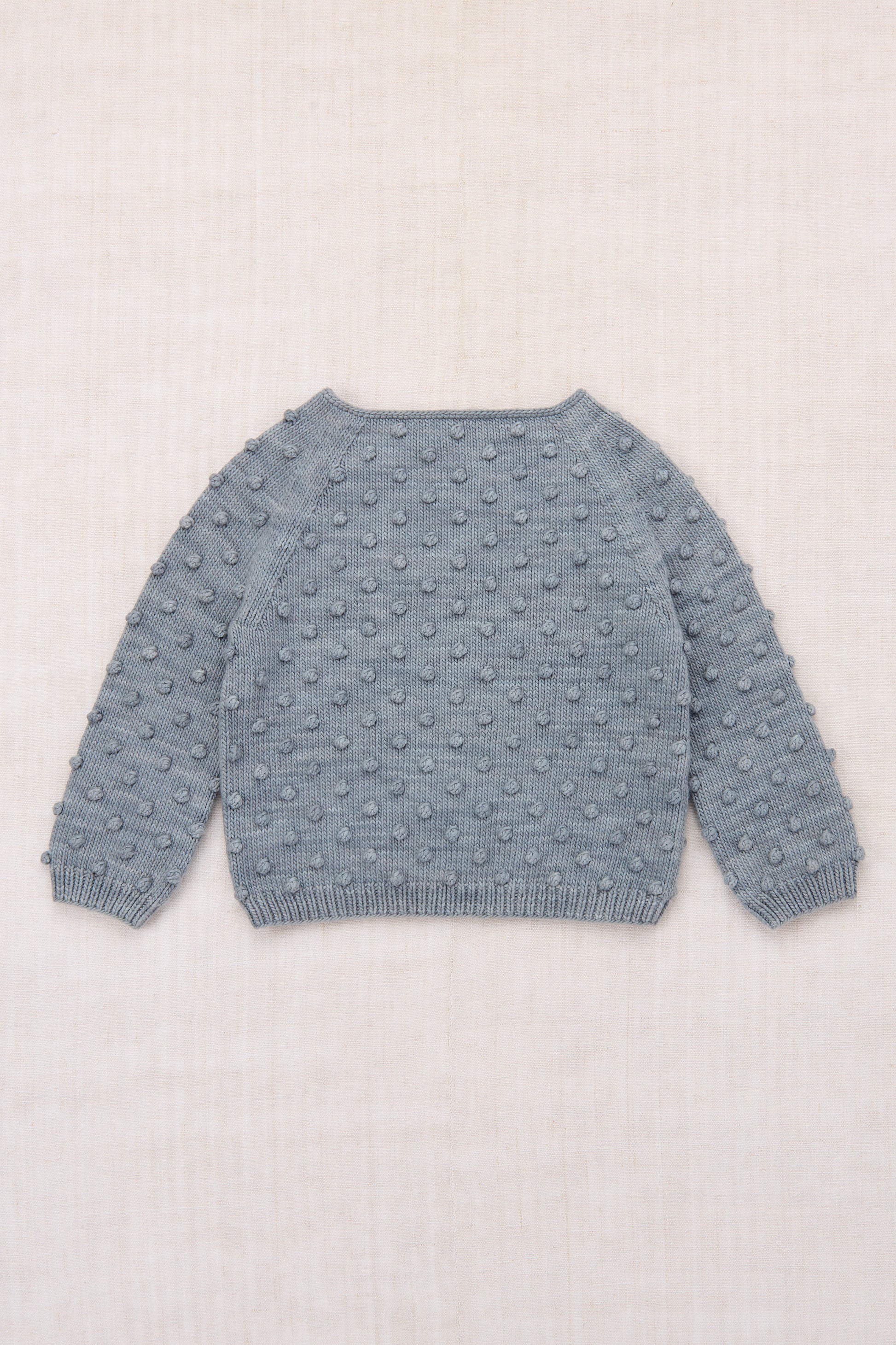 Misha & Puff’s signature hand-knit sweater in Pima cotton for warmer seasons, featuring an all-over popcorn stitch, rolled bateau neckline, ribbed cuffs and hem, and corozo button keyhole closure at the back neck.