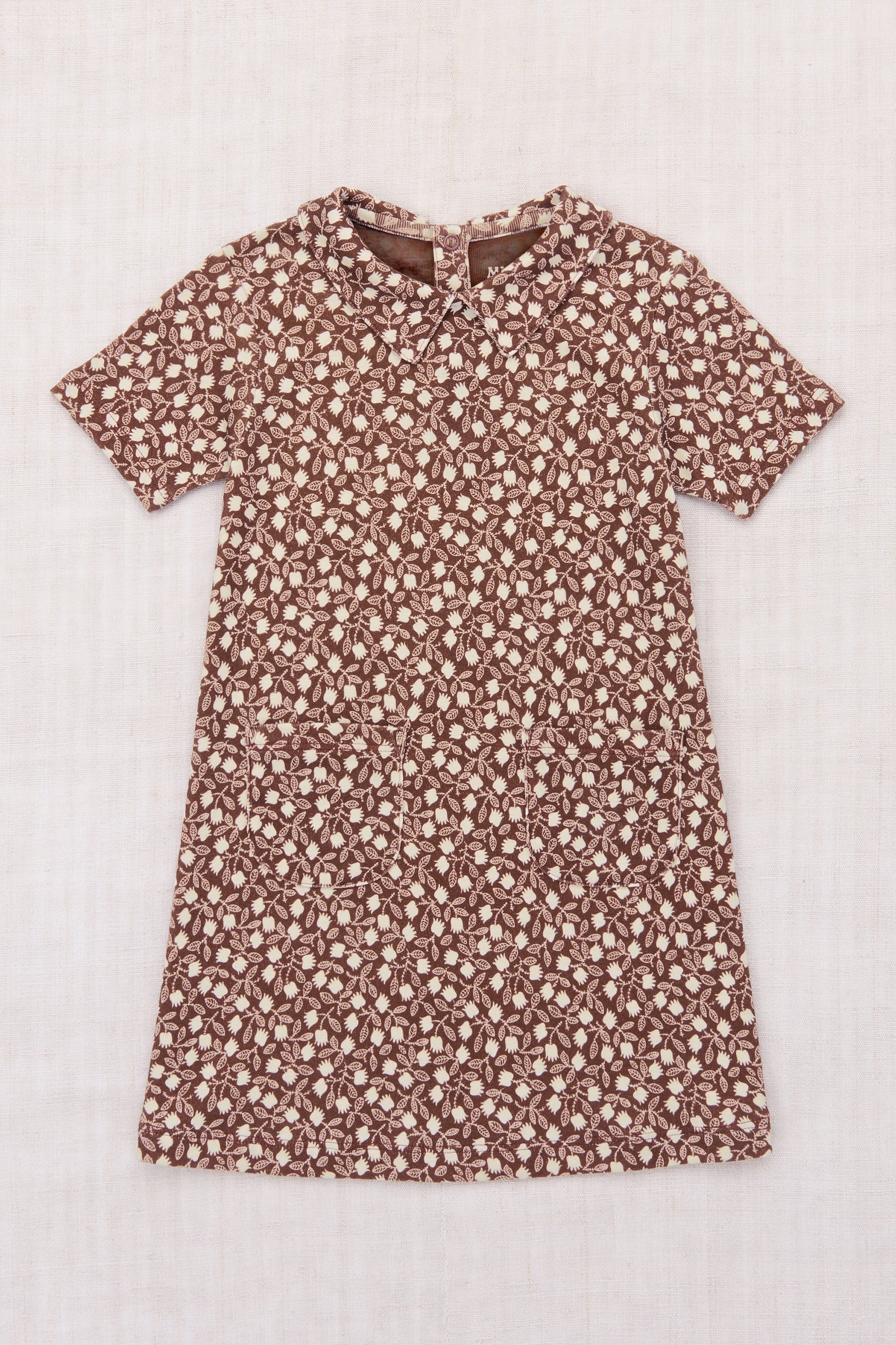 A short-sleeved dress in organic Pima cotton, featuring a mod-inspired silhouette and collar, two patch pockets, and snap closure at the back neck.