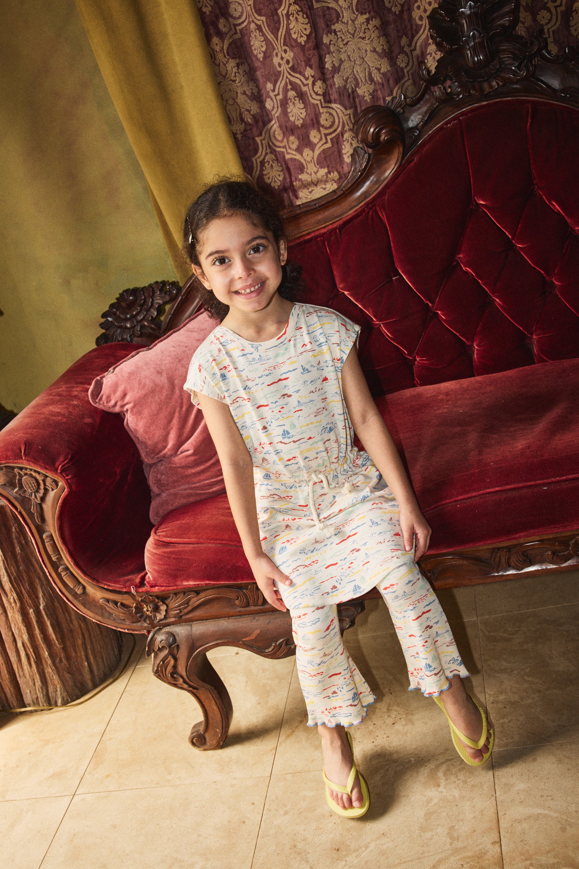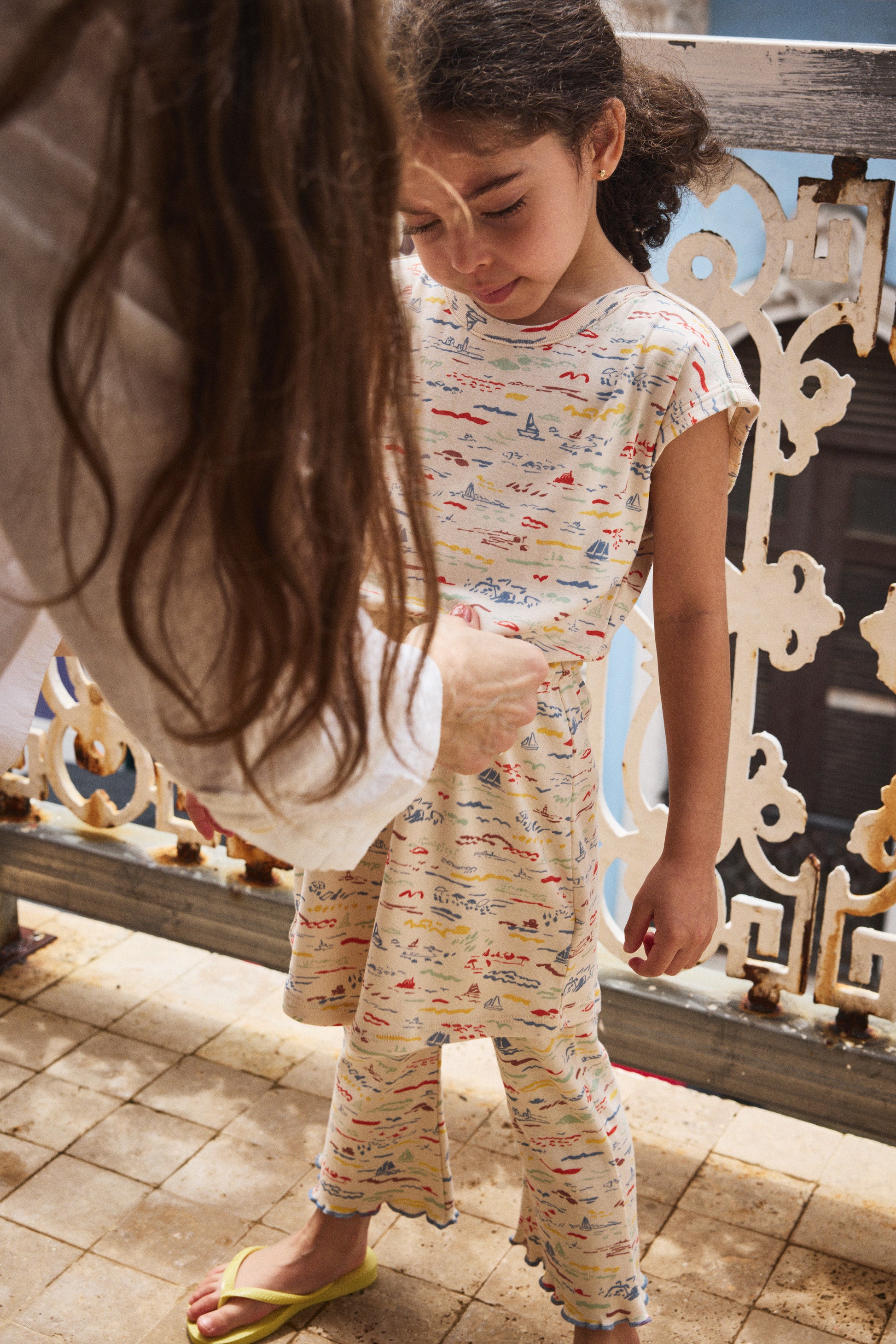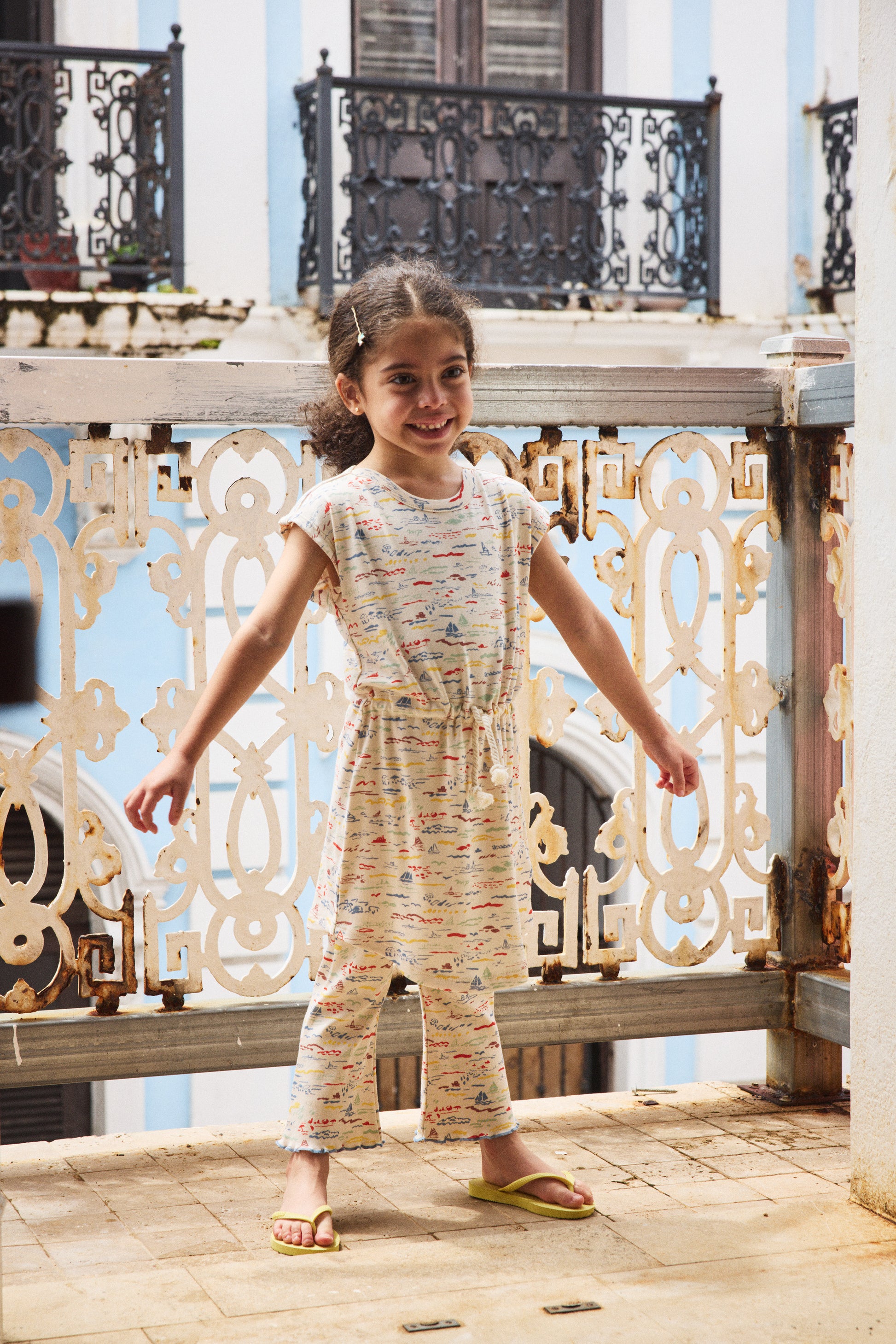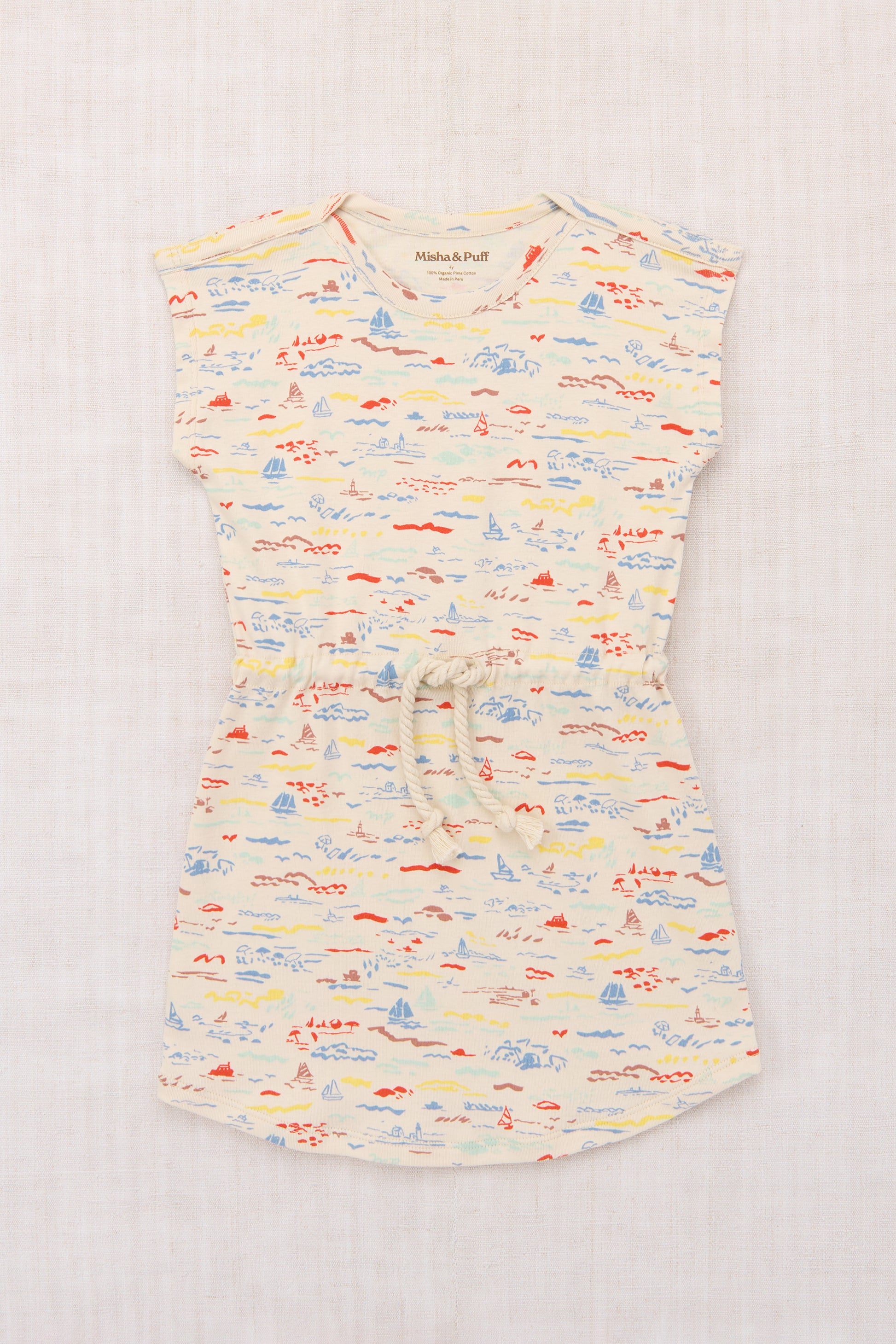 A cover-up dress in organic Pima cotton, with lap sleeve detail, a rope waist tie, and a rounded hem. Featuring a hand-drawn print — an ode to our home.