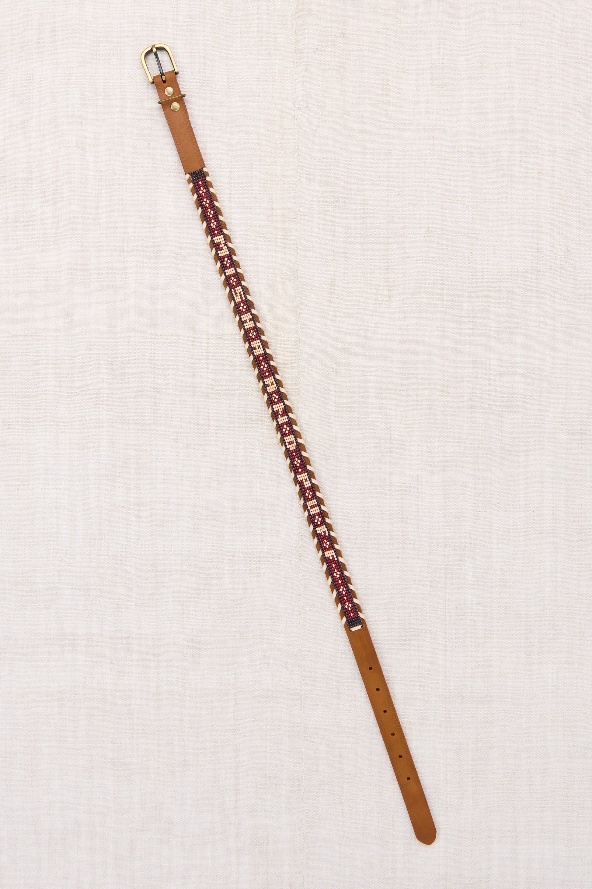 A leather belt featuring hand-beaded glass details, a curved buckle, and leather whipstitch trim.