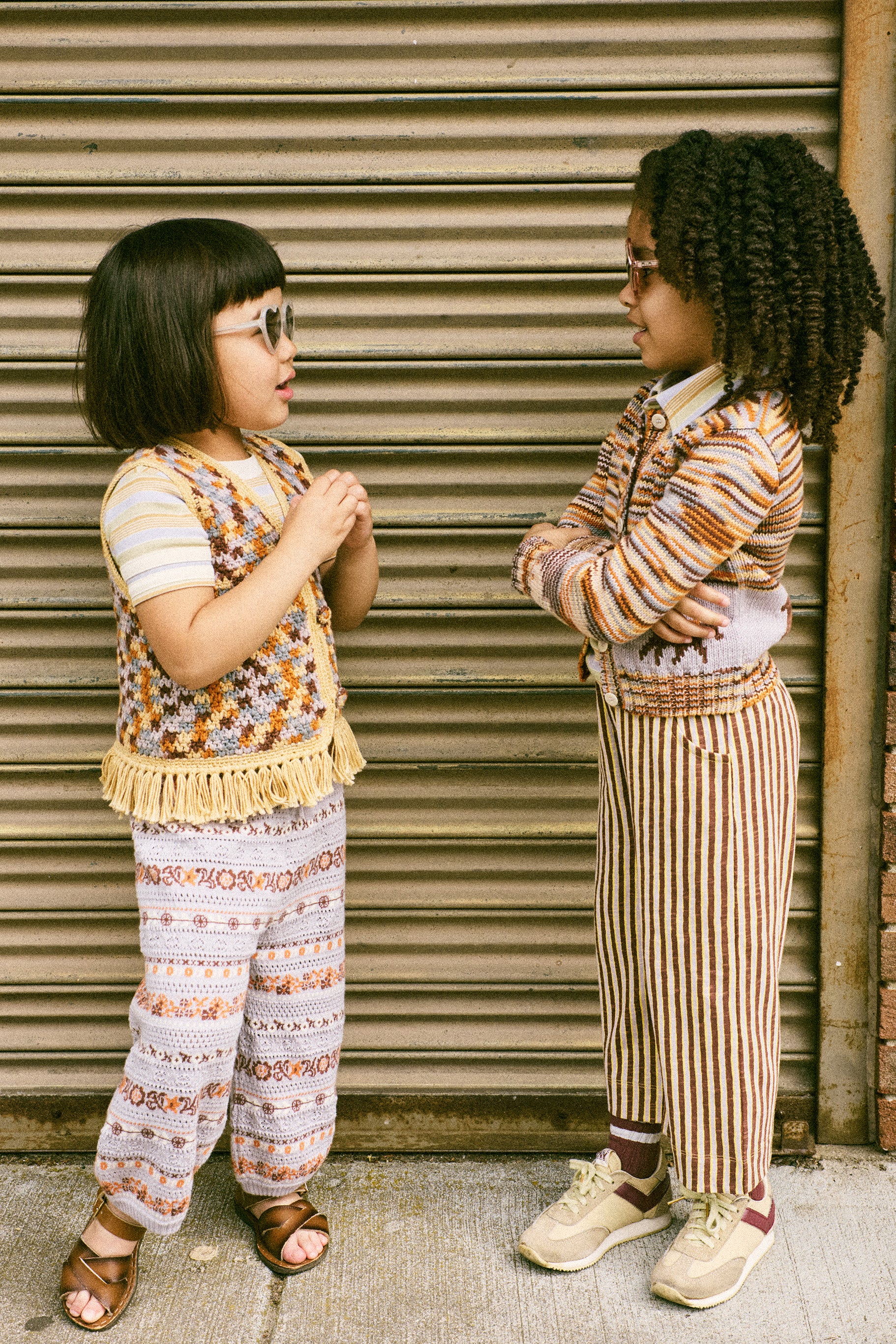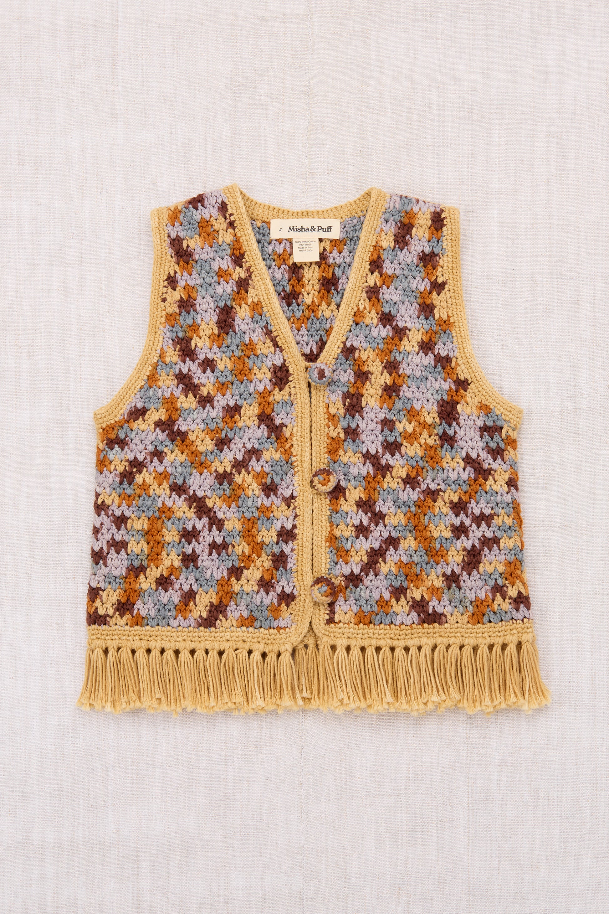 A hand-crocheted vest in Pima cotton, with contrast trim and crochet button closure. Finished with tassel fringe trim.