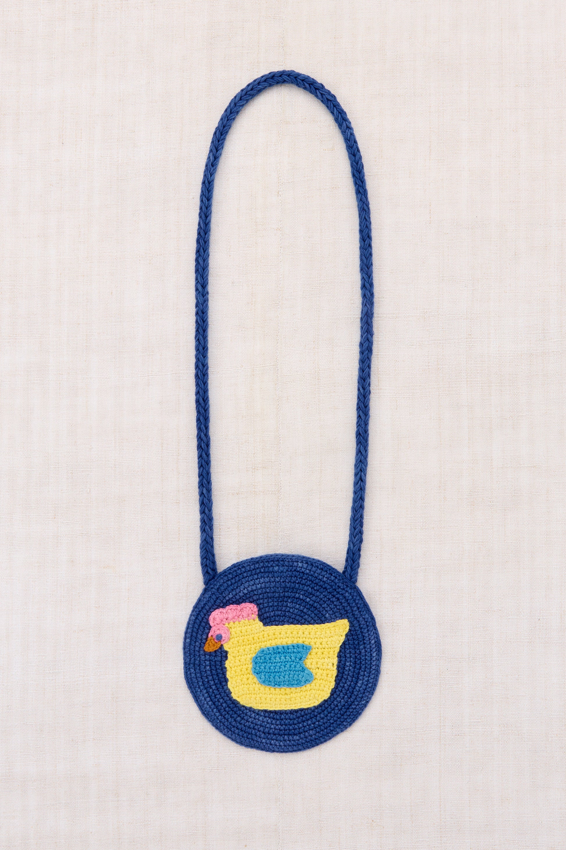 A hand-crocheted bag in Pima cotton, featuring a crocheted appliqué motif and magnetic snap closure.
