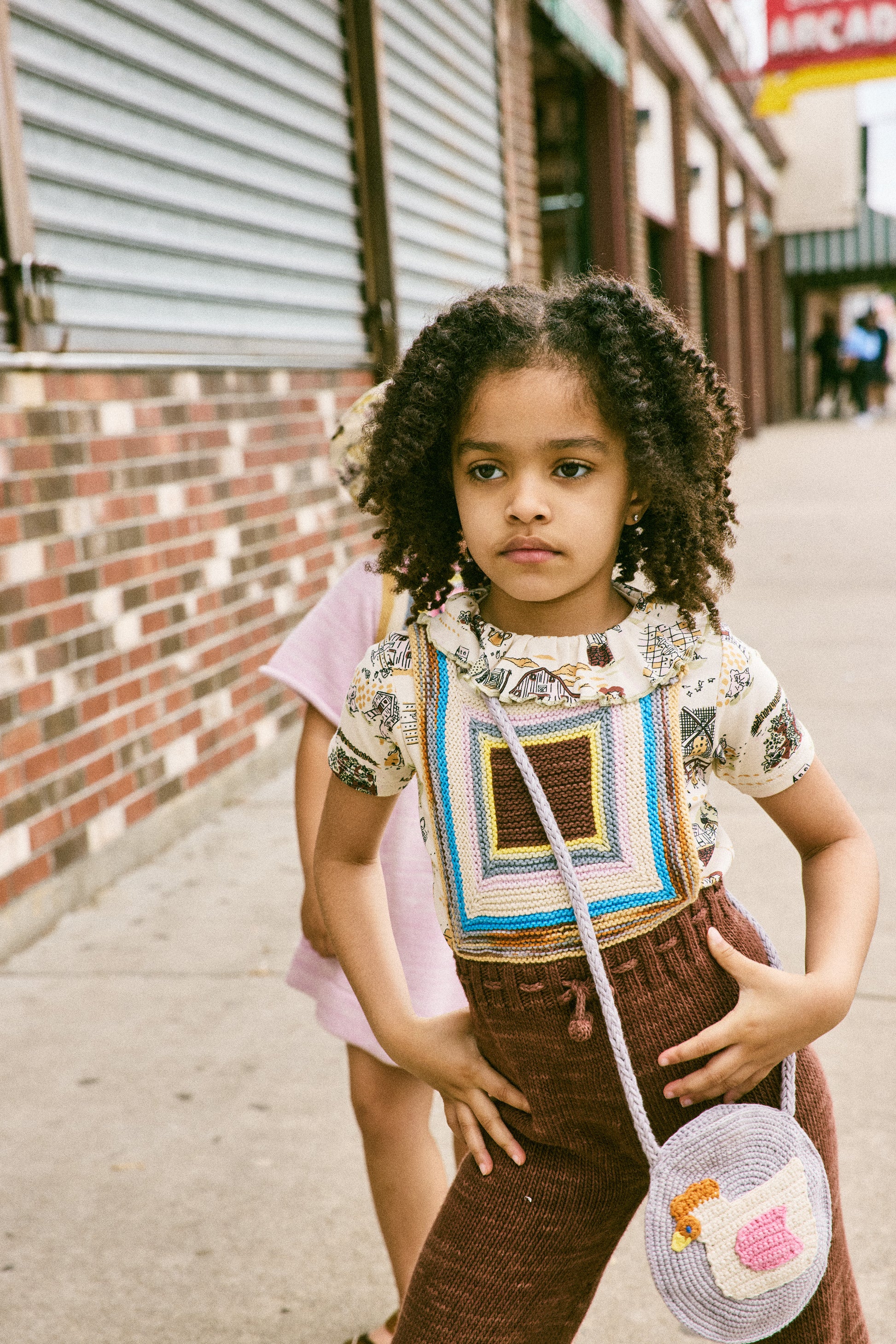 A hand-crocheted bag in Pima cotton, featuring a crocheted appliqué motif and magnetic snap closure.