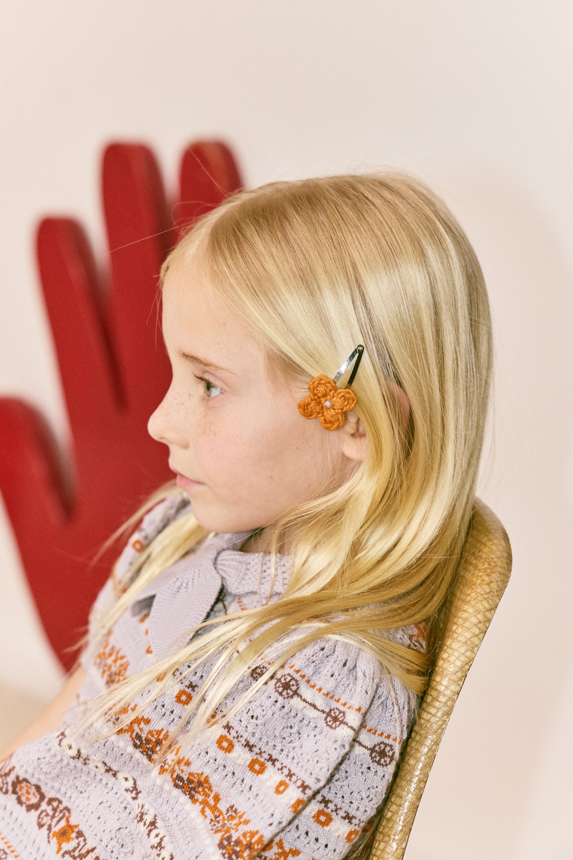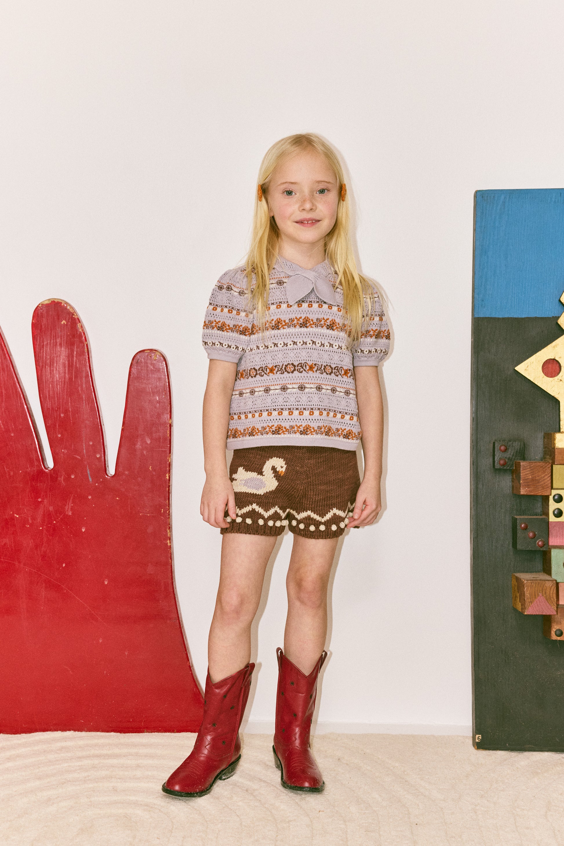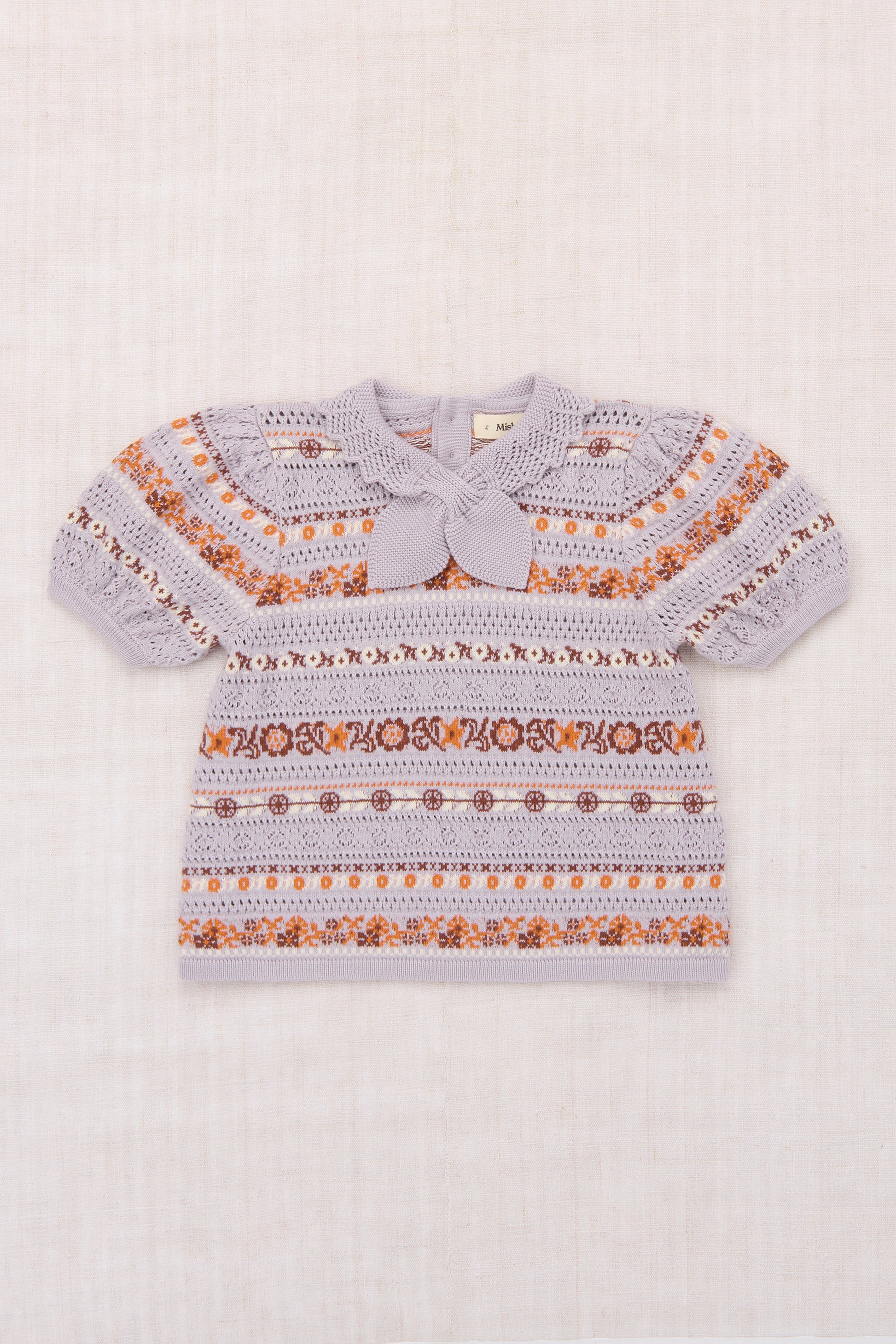 A short-sleeved top in a graphic fine-gauge Pima cotton knit, featuring a floral pattern with pointelle and eyelet accents, a pull-through kerchief secured at the neck, ribbed trim, and corozo button closure at the back neck.
