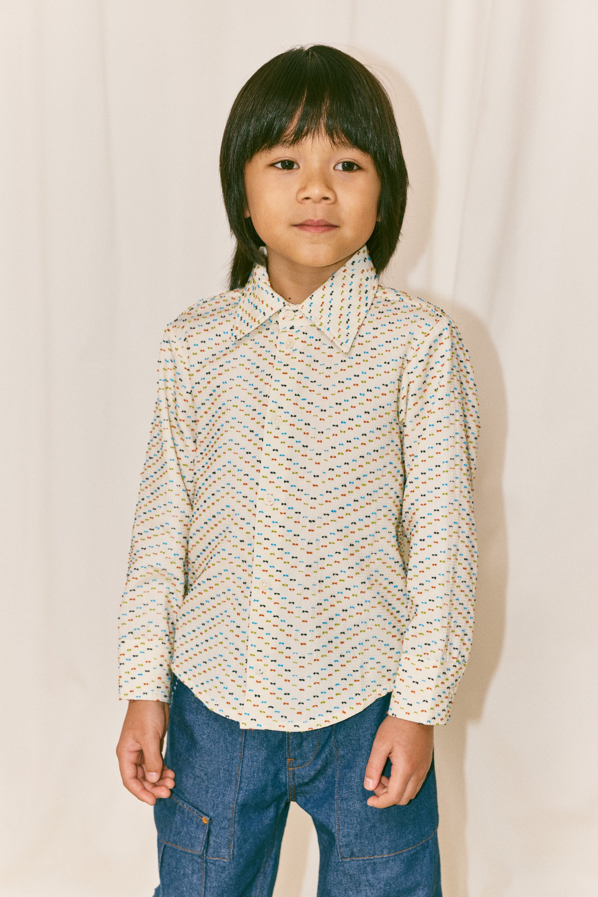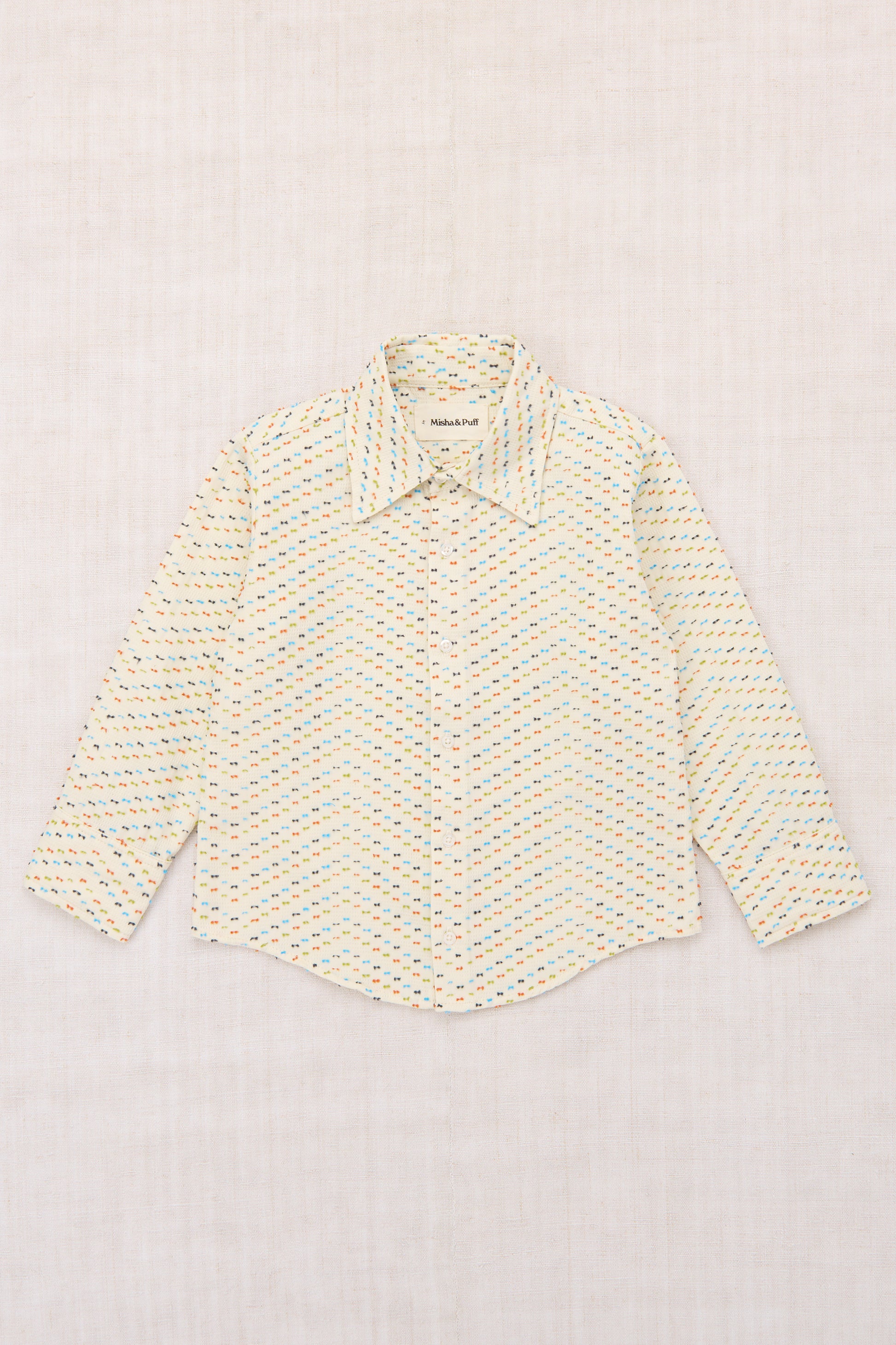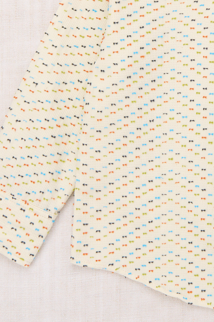 A button down shirt in a textured organic cotton jacquard, featuring a relaxed silhouette, point collar, rounded hem, and corozo button closure. Finished with French seams.