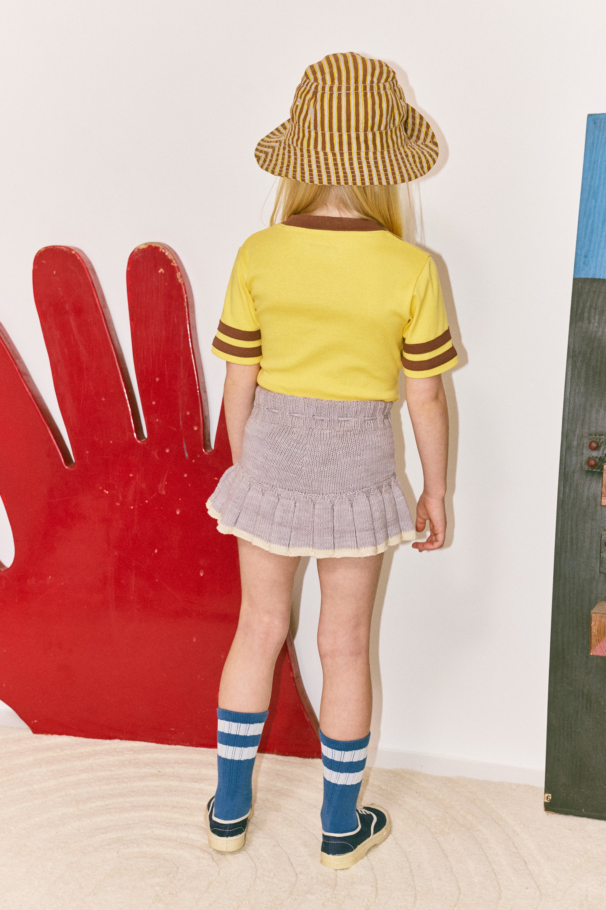 A hand-knit skirt in Pima cotton, featuring contrast striped trim, attached bloomers with ribbed cuffs and a ribbed waistband with a popcorn-tie drawstring for a secure fit.