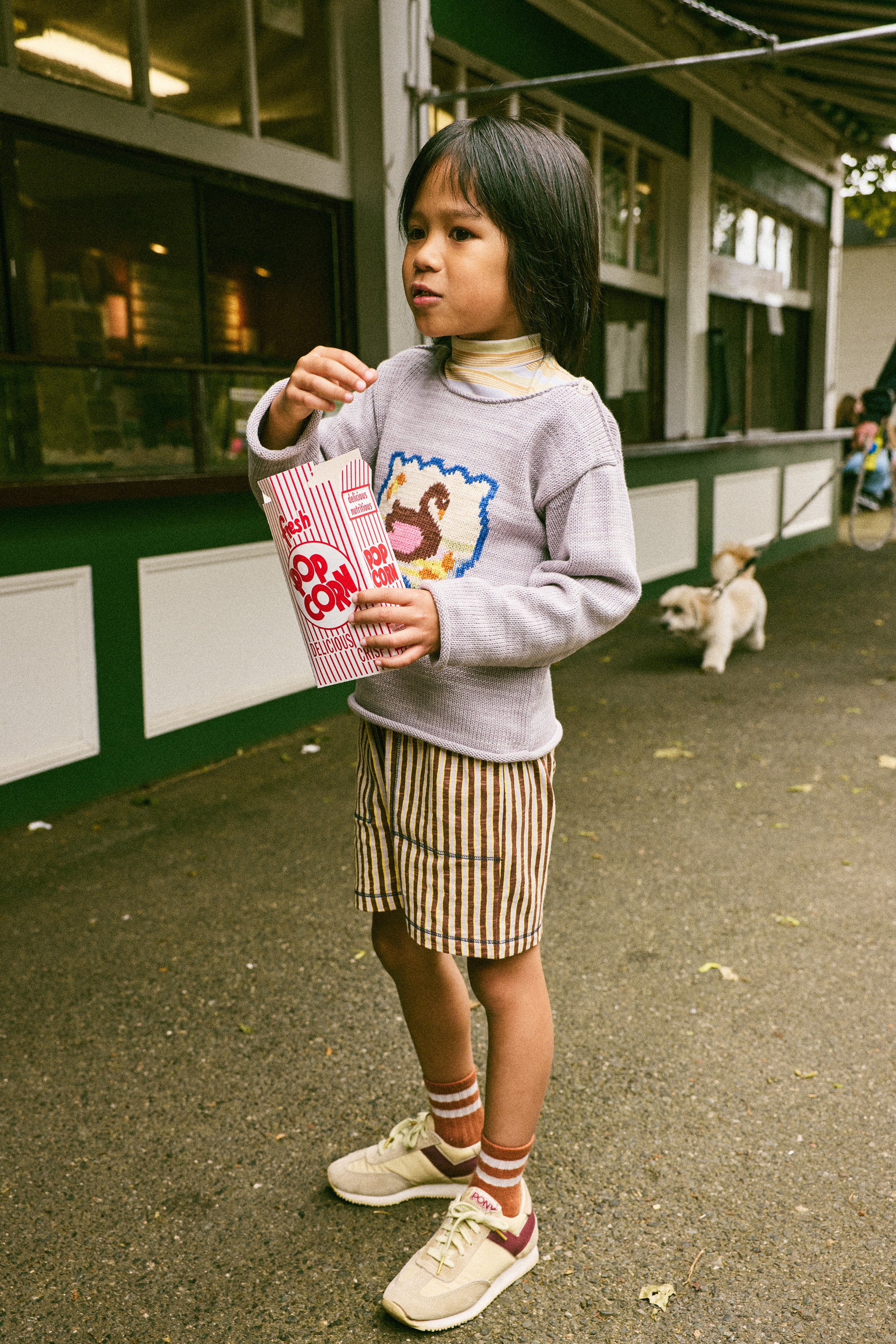 A boatneck sweater in Pima cotton, featuring a graphic intarsia and corozo buttons at the shoulder.